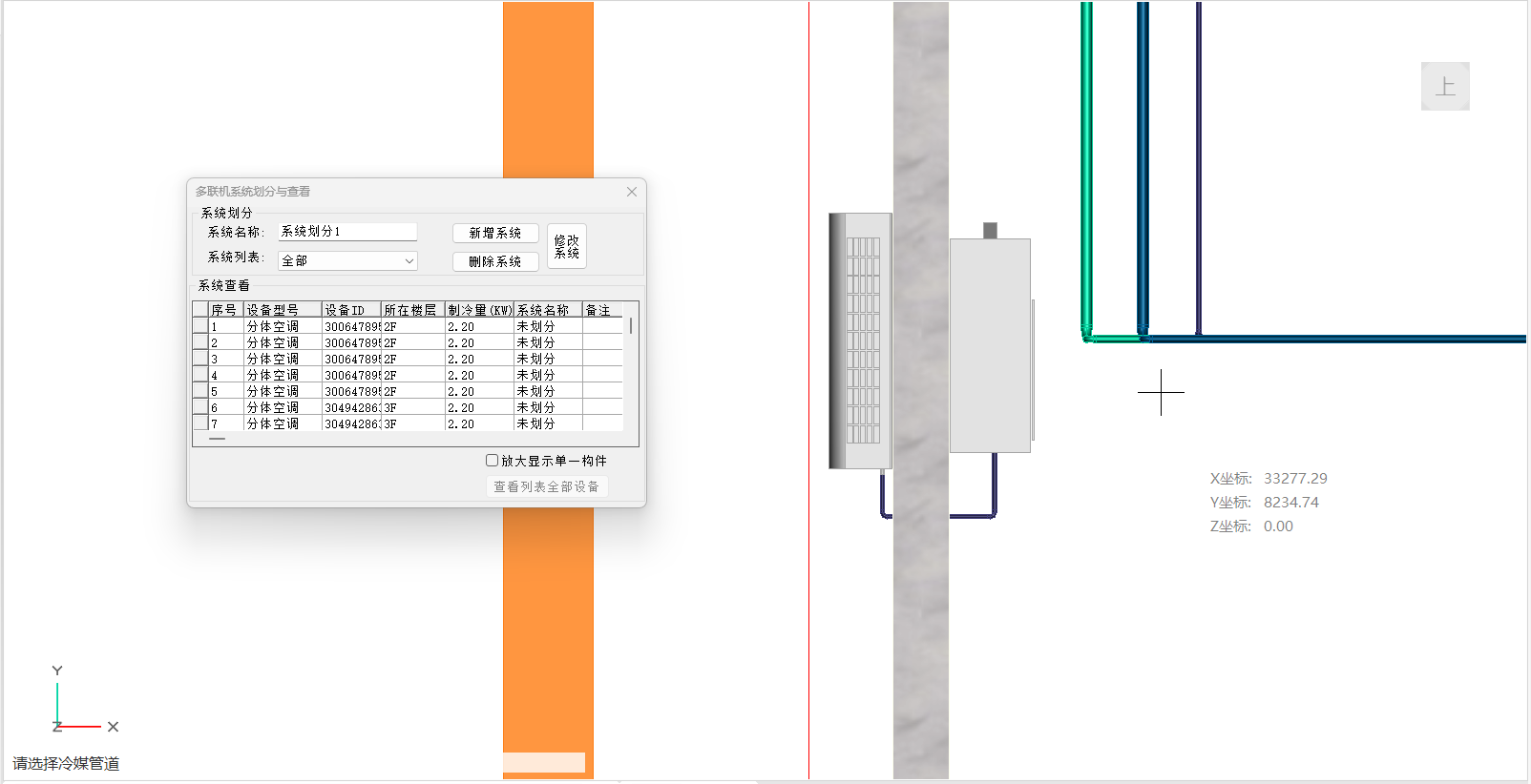 目录 搜索 展开 PKPM-BIM 项目应用案例教程第1章 建筑设计模块1.1 创建新项目1.1.1 创建新项目1.1.2 项目参数设置1.1.3 楼层设置1.1.4 放置轴网元素1.1.5 创建场地1.2 创建一层建筑主体1.2.1 创建柱1.2.2 创建墙1.2.3 创建楼板1.2.4 放置门窗1.2.4.1 普通门窗的设置1.2.4.2 常用设置集的配置1.2.4.3 自定义门窗设置1.2.4.4 放置门1.2.4.5 放置窗1.2.5 放置幕墙1.2.5.1 创建幕墙1.2.5.2 幕墙与墙体的剪切1.2.5.3 幕墙编辑1.2.6 创建房间、区域、楼梯1.2.6.1 创建房间1.2.6.2 创建防火分区1.2.6.3 创建楼梯1.3 创建二层建筑主体1.3.1 过滤选择1.3.2 局部复制1.3.3 二层构件修改1.3.3.1 墙体调整1.3.3.2 创建栏杆扶手1.3.3.3 放置门窗1.3.3.4 放置楼梯1.3.3.5 板上开洞1.3.3.6 创建房间和区域1.4创建三、四层建筑主体1.4.1 楼层复制1.4.2 楼板轮廓修改1.4.3 修改门窗1.5 创建屋顶层1.5.1 增强过滤器1.5.2 局部复制1.5.3 .同类构件的快速删除1.5.4 .墙体调整1.5.5 创建楼板1.5.6 创建门窗1.5.7 创建楼梯、栏杆1.5.8 创建房间和区域1.6 细部模型建立1.6.1 补充构件 1.6.1.1 增加台阶和坡道 1.6.1.2 增加栏杆扶手 1.6.1.3 增加雨棚 1.6.1.4 增加烟道 1.6.1.5 烟道洞口布置 1.6.2 放置素材1.6.2.1 素材库1.6.2.2 符号库1.6.2.3 参数化组件库1.7 清单1.8 智能审查1.9 出图1.9.1 出图流程介绍1.9.2 视图创建1.9.3 标注制图1.9.4 显示方案设置1.9.5 视图属性设置1.9.6 生成图纸1.9.7 成果导出第2章 结构设计模块2.1 新建项目 2.2 建立轴网 2.3 上部结构建模 2.4 楼层管理 2.5 计算分析前处理 2.6 计算结果查看 2.7 生成施工图 2.8 施工图审查第3章 暖通设计模块3.1 基本设置3.1.1 读取项目3.1.2 选择楼层3.1.3工程设置3.2 风系统建模3.2.1 风管绘制3.2.2 风口布置及连接3.3 空调水系统建模3.3.1 水管绘制3.3.2 风机盘管布置3.3.3 设备智能连接3.4 多联机系统3.4.1 室内外机布置3.4.2 多联机连管3.4.3 系统划分3.5 楼层复制3.6 材料统计3.6.1 材料统计3.6.2 材料结果查询3.7 模型审查3.7.1 全局属性3.7.2 条文审查3.7.3 调整模型3.8 暖通出图3.8.1 出图流程介绍3.8.2 视图映射创建3.8.3 标注制图3.8.4 显示方案设置3.8.5 视图属性设置3.8.6 生成图纸3.8.7 成果导出第4章 给排水设计模块4.1 设置4.1.1基本设置4.1.2系统设置4.2 给排水系统建模4.2.1 给排水管道绘制4.2.2 卫浴设备布置4.2.3 智能连接4.3 消火栓系统建模4.3.1 消火栓管绘制4.3.2 消火栓灭火器布置及连接4.4 喷淋系统建模4.4.1 喷头布置4.4.2 喷头连接4.4.3 识图建模4.5楼层复制4.6 材料统计4.6.1 材料统计4.6.2 材料结果查询4.7模型审查4.7.1 全局属性 4.7.2 条文审查4.7.3 调整模型4.8给排水出图4.8.1出图流程介绍4.8.2视图映射创建4.8.3标注制图4.8.4显示方案设置4.8.5视图属性设置4.8.6生成图纸4.8.7成果导出第5章 电气设计模块5.1 基本设置5.1.1 基本设置5.1.2 工程设置5.2 配电系统布置 5.2.1 配电柜布置5.2.2配电室桥架布置5.2.3配电室电缆沟布置5.2.4配电室变压器布置5.2.5配电箱布置5.3 照明系统布置5.3.1正常照明点位布置5.3.2应急照明照明点位布置5.4 火灾自动报警系统布置5.4.1 温感烟感点位布置5.4.2 消防广播点位布置5.4.3手报、声光报警器、消火栓启泵按钮、消防电话点位布置5.4.4消防端子箱布置5.5 弱电安防系统布置5.5.1监控摄像头点位布置5.5.2弱电插座点位布置5.5.3弱电机柜点位布置5.5.4识图建模5.6 平面布线5.6.1 设备连接5.6.2线管避让5.7楼层复制5.7.1 楼层复制5.8 材料统计5.8.1 材料统计5.8.2 材料结果查询5.9模型审查5.9.1 智能审查规则5.9.2 审查流程第6章 协同设计模块6.1 碰撞检查6.2 开洞提资6.2.1 生成开洞提资条件6.2.2 实际洞口处理生成6.3 净高分析6.3.1 净高设置6.3.2 净高平面6.3.3 净高检查6.4 模型链接6.5 合并工程 暂无相关搜索结果! 3.4.3 系统划分 操作步骤:点击多联机工具栏中-系统划分,左键点选需要系统划分的冷媒管,分支中的所有构建均会高亮显示,并在系统查看界面中显示分支所连接的室内机与室外机,在系统名称中输入新的名称,并点击新增系统完成划分,如图3.4-3; 图 3.4-3 系统划分