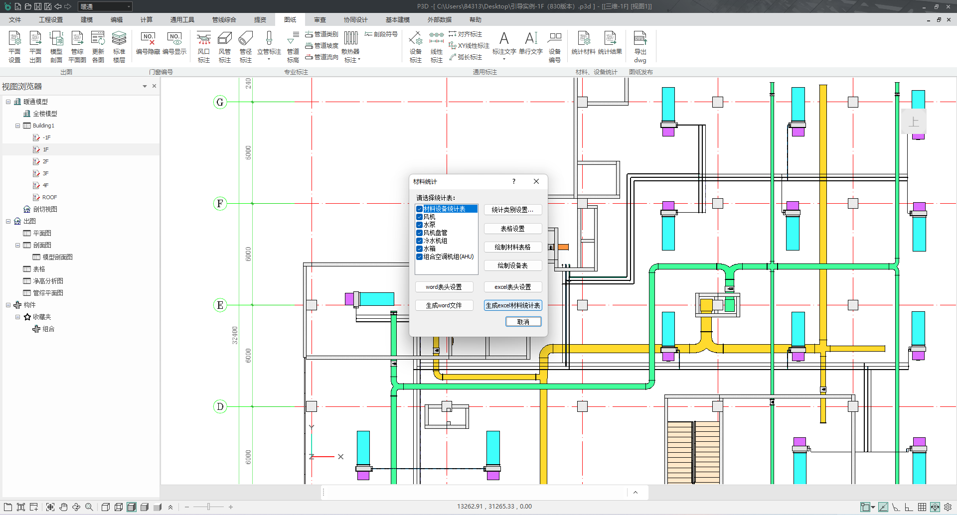 目录 搜索 展开 PKPM-BIM 项目应用案例教程第1章 建筑设计模块1.1 创建新项目1.1.1 创建新项目1.1.2 项目参数设置1.1.3 楼层设置1.1.4 放置轴网元素1.1.5 创建场地1.2 创建一层建筑主体1.2.1 创建柱1.2.2 创建墙1.2.3 创建楼板1.2.4 放置门窗1.2.4.1 普通门窗的设置1.2.4.2 常用设置集的配置1.2.4.3 自定义门窗设置1.2.4.4 放置门1.2.4.5 放置窗1.2.5 放置幕墙1.2.5.1 创建幕墙1.2.5.2 幕墙与墙体的剪切1.2.5.3 幕墙编辑1.2.6 创建房间、区域、楼梯1.2.6.1 创建房间1.2.6.2 创建防火分区1.2.6.3 创建楼梯1.3 创建二层建筑主体1.3.1 过滤选择1.3.2 局部复制1.3.3 二层构件修改1.3.3.1 墙体调整1.3.3.2 创建栏杆扶手1.3.3.3 放置门窗1.3.3.4 放置楼梯1.3.3.5 板上开洞1.3.3.6 创建房间和区域1.4创建三、四层建筑主体1.4.1 楼层复制1.4.2 楼板轮廓修改1.4.3 修改门窗1.5 创建屋顶层1.5.1 增强过滤器1.5.2 局部复制1.5.3 .同类构件的快速删除1.5.4 .墙体调整1.5.5 创建楼板1.5.6 创建门窗1.5.7 创建楼梯、栏杆1.5.8 创建房间和区域1.6 细部模型建立1.6.1 补充构件 1.6.1.1 增加台阶和坡道 1.6.1.2 增加栏杆扶手 1.6.1.3 增加雨棚 1.6.1.4 增加烟道 1.6.1.5 烟道洞口布置 1.6.2 放置素材1.6.2.1 素材库1.6.2.2 符号库1.6.2.3 参数化组件库1.7 清单1.8 智能审查1.9 出图1.9.1 出图流程介绍1.9.2 视图创建1.9.3 标注制图1.9.4 显示方案设置1.9.5 视图属性设置1.9.6 生成图纸1.9.7 成果导出第2章 结构设计模块2.1 新建项目 2.2 建立轴网 2.3 上部结构建模 2.4 楼层管理 2.5 计算分析前处理 2.6 计算结果查看 2.7 生成施工图 2.8 施工图审查第3章 暖通设计模块3.1 基本设置3.1.1 读取项目3.1.2 选择楼层3.1.3工程设置3.2 风系统建模3.2.1 风管绘制3.2.2 风口布置及连接3.3 空调水系统建模3.3.1 水管绘制3.3.2 风机盘管布置3.3.3 设备智能连接3.4 多联机系统3.4.1 室内外机布置3.4.2 多联机连管3.4.3 系统划分3.5 楼层复制3.6 材料统计3.6.1 材料统计3.6.2 材料结果查询3.7 模型审查3.7.1 全局属性3.7.2 条文审查3.7.3 调整模型3.8 暖通出图3.8.1 出图流程介绍3.8.2 视图映射创建3.8.3 标注制图3.8.4 显示方案设置3.8.5 视图属性设置3.8.6 生成图纸3.8.7 成果导出第4章 给排水设计模块4.1 设置4.1.1基本设置4.1.2系统设置4.2 给排水系统建模4.2.1 给排水管道绘制4.2.2 卫浴设备布置4.2.3 智能连接4.3 消火栓系统建模4.3.1 消火栓管绘制4.3.2 消火栓灭火器布置及连接4.4 喷淋系统建模4.4.1 喷头布置4.4.2 喷头连接4.4.3 识图建模4.5楼层复制4.6 材料统计4.6.1 材料统计4.6.2 材料结果查询4.7模型审查4.7.1 全局属性 4.7.2 条文审查4.7.3 调整模型4.8给排水出图4.8.1出图流程介绍4.8.2视图映射创建4.8.3标注制图4.8.4显示方案设置4.8.5视图属性设置4.8.6生成图纸4.8.7成果导出第5章 电气设计模块5.1 基本设置5.1.1 基本设置5.1.2 工程设置5.2 配电系统布置 5.2.1 配电柜布置5.2.2配电室桥架布置5.2.3配电室电缆沟布置5.2.4配电室变压器布置5.2.5配电箱布置5.3 照明系统布置5.3.1正常照明点位布置5.3.2应急照明照明点位布置5.4 火灾自动报警系统布置5.4.1 温感烟感点位布置5.4.2 消防广播点位布置5.4.3手报、声光报警器、消火栓启泵按钮、消防电话点位布置5.4.4消防端子箱布置5.5 弱电安防系统布置5.5.1监控摄像头点位布置5.5.2弱电插座点位布置5.5.3弱电机柜点位布置5.5.4识图建模5.6 平面布线5.6.1 设备连接5.6.2线管避让5.7楼层复制5.7.1 楼层复制5.8 材料统计5.8.1 材料统计5.8.2 材料结果查询5.9模型审查5.9.1 智能审查规则5.9.2 审查流程第6章 协同设计模块6.1 碰撞检查6.2 开洞提资6.2.1 生成开洞提资条件6.2.2 实际洞口处理生成6.3 净高分析6.3.1 净高设置6.3.2 净高平面6.3.3 净高检查6.4 模型链接6.5 合并工程 暂无相关搜索结果! 3.6.1 材料统计 操作步骤:1.点击【图纸】-【材料、设备统计】模块中的统计材料功能,勾选统计表所包含信息,并可通过表格的表头设置及统计类别设置调整对应统计模式和统计表格样式,点击生成文件,生成材料统计表格,如图3.6-1; 图 3.6-1 材料统计