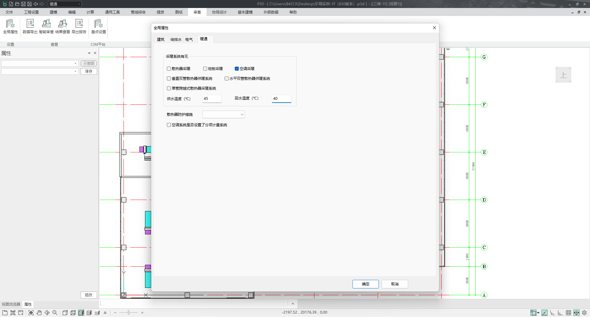 目录 搜索 展开 PKPM-BIM 项目应用案例教程第1章 建筑设计模块1.1 创建新项目1.1.1 创建新项目1.1.2 项目参数设置1.1.3 楼层设置1.1.4 放置轴网元素1.1.5 创建场地1.2 创建一层建筑主体1.2.1 创建柱1.2.2 创建墙1.2.3 创建楼板1.2.4 放置门窗1.2.4.1 普通门窗的设置1.2.4.2 常用设置集的配置1.2.4.3 自定义门窗设置1.2.4.4 放置门1.2.4.5 放置窗1.2.5 放置幕墙1.2.5.1 创建幕墙1.2.5.2 幕墙与墙体的剪切1.2.5.3 幕墙编辑1.2.6 创建房间、区域、楼梯1.2.6.1 创建房间1.2.6.2 创建防火分区1.2.6.3 创建楼梯1.3 创建二层建筑主体1.3.1 过滤选择1.3.2 局部复制1.3.3 二层构件修改1.3.3.1 墙体调整1.3.3.2 创建栏杆扶手1.3.3.3 放置门窗1.3.3.4 放置楼梯1.3.3.5 板上开洞1.3.3.6 创建房间和区域1.4创建三、四层建筑主体1.4.1 楼层复制1.4.2 楼板轮廓修改1.4.3 修改门窗1.5 创建屋顶层1.5.1 增强过滤器1.5.2 局部复制1.5.3 .同类构件的快速删除1.5.4 .墙体调整1.5.5 创建楼板1.5.6 创建门窗1.5.7 创建楼梯、栏杆1.5.8 创建房间和区域1.6 细部模型建立1.6.1 补充构件 1.6.1.1 增加台阶和坡道 1.6.1.2 增加栏杆扶手 1.6.1.3 增加雨棚 1.6.1.4 增加烟道 1.6.1.5 烟道洞口布置 1.6.2 放置素材1.6.2.1 素材库1.6.2.2 符号库1.6.2.3 参数化组件库1.7 清单1.8 智能审查1.9 出图1.9.1 出图流程介绍1.9.2 视图创建1.9.3 标注制图1.9.4 显示方案设置1.9.5 视图属性设置1.9.6 生成图纸1.9.7 成果导出第2章 结构设计模块2.1 新建项目 2.2 建立轴网 2.3 上部结构建模 2.4 楼层管理 2.5 计算分析前处理 2.6 计算结果查看 2.7 生成施工图 2.8 施工图审查第3章 暖通设计模块3.1 基本设置3.1.1 读取项目3.1.2 选择楼层3.1.3工程设置3.2 风系统建模3.2.1 风管绘制3.2.2 风口布置及连接3.3 空调水系统建模3.3.1 水管绘制3.3.2 风机盘管布置3.3.3 设备智能连接3.4 多联机系统3.4.1 室内外机布置3.4.2 多联机连管3.4.3 系统划分3.5 楼层复制3.6 材料统计3.6.1 材料统计3.6.2 材料结果查询3.7 模型审查3.7.1 全局属性3.7.2 条文审查3.7.3 调整模型3.8 暖通出图3.8.1 出图流程介绍3.8.2 视图映射创建3.8.3 标注制图3.8.4 显示方案设置3.8.5 视图属性设置3.8.6 生成图纸3.8.7 成果导出第4章 给排水设计模块4.1 设置4.1.1基本设置4.1.2系统设置4.2 给排水系统建模4.2.1 给排水管道绘制4.2.2 卫浴设备布置4.2.3 智能连接4.3 消火栓系统建模4.3.1 消火栓管绘制4.3.2 消火栓灭火器布置及连接4.4 喷淋系统建模4.4.1 喷头布置4.4.2 喷头连接4.4.3 识图建模4.5楼层复制4.6 材料统计4.6.1 材料统计4.6.2 材料结果查询4.7模型审查4.7.1 全局属性 4.7.2 条文审查4.7.3 调整模型4.8给排水出图4.8.1出图流程介绍4.8.2视图映射创建4.8.3标注制图4.8.4显示方案设置4.8.5视图属性设置4.8.6生成图纸4.8.7成果导出第5章 电气设计模块5.1 基本设置5.1.1 基本设置5.1.2 工程设置5.2 配电系统布置 5.2.1 配电柜布置5.2.2配电室桥架布置5.2.3配电室电缆沟布置5.2.4配电室变压器布置5.2.5配电箱布置5.3 照明系统布置5.3.1正常照明点位布置5.3.2应急照明照明点位布置5.4 火灾自动报警系统布置5.4.1 温感烟感点位布置5.4.2 消防广播点位布置5.4.3手报、声光报警器、消火栓启泵按钮、消防电话点位布置5.4.4消防端子箱布置5.5 弱电安防系统布置5.5.1监控摄像头点位布置5.5.2弱电插座点位布置5.5.3弱电机柜点位布置5.5.4识图建模5.6 平面布线5.6.1 设备连接5.6.2线管避让5.7楼层复制5.7.1 楼层复制5.8 材料统计5.8.1 材料统计5.8.2 材料结果查询5.9模型审查5.9.1 智能审查规则5.9.2 审查流程第6章 协同设计模块6.1 碰撞检查6.2 开洞提资6.2.1 生成开洞提资条件6.2.2 实际洞口处理生成6.3 净高分析6.3.1 净高设置6.3.2 净高平面6.3.3 净高检查6.4 模型链接6.5 合并工程 暂无相关搜索结果! 3.7.1 全局属性 操作步骤:3.7.1 全局属性1.点击【智能审查】,首先弹出全局属性设置界面,根据项目情况选择对应采暖系统类型,以及空调系统是否设置分项计量系统,另外也可直接点击【全局属性】命令进行设置,如图3.7-2; 图 3.7-2 全局属性设置