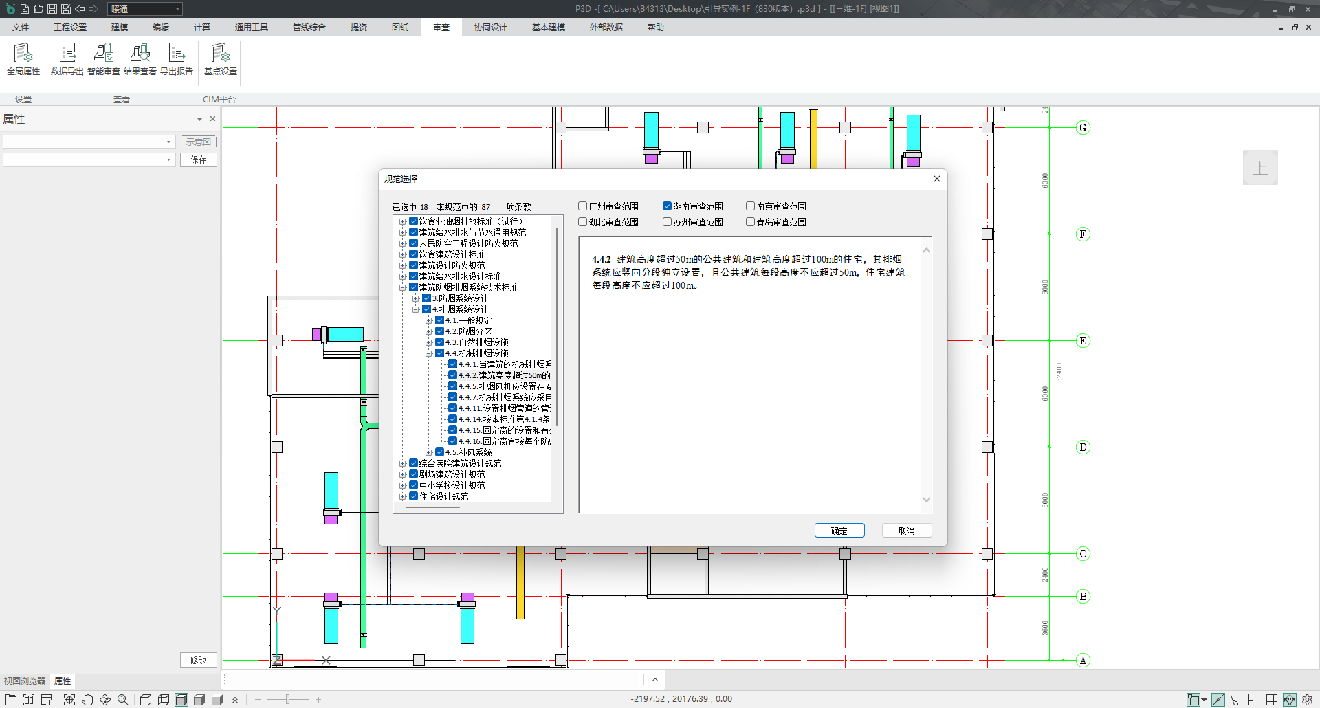 目录 搜索 展开 PKPM-BIM 项目应用案例教程第1章 建筑设计模块1.1 创建新项目1.1.1 创建新项目1.1.2 项目参数设置1.1.3 楼层设置1.1.4 放置轴网元素1.1.5 创建场地1.2 创建一层建筑主体1.2.1 创建柱1.2.2 创建墙1.2.3 创建楼板1.2.4 放置门窗1.2.4.1 普通门窗的设置1.2.4.2 常用设置集的配置1.2.4.3 自定义门窗设置1.2.4.4 放置门1.2.4.5 放置窗1.2.5 放置幕墙1.2.5.1 创建幕墙1.2.5.2 幕墙与墙体的剪切1.2.5.3 幕墙编辑1.2.6 创建房间、区域、楼梯1.2.6.1 创建房间1.2.6.2 创建防火分区1.2.6.3 创建楼梯1.3 创建二层建筑主体1.3.1 过滤选择1.3.2 局部复制1.3.3 二层构件修改1.3.3.1 墙体调整1.3.3.2 创建栏杆扶手1.3.3.3 放置门窗1.3.3.4 放置楼梯1.3.3.5 板上开洞1.3.3.6 创建房间和区域1.4创建三、四层建筑主体1.4.1 楼层复制1.4.2 楼板轮廓修改1.4.3 修改门窗1.5 创建屋顶层1.5.1 增强过滤器1.5.2 局部复制1.5.3 .同类构件的快速删除1.5.4 .墙体调整1.5.5 创建楼板1.5.6 创建门窗1.5.7 创建楼梯、栏杆1.5.8 创建房间和区域1.6 细部模型建立1.6.1 补充构件 1.6.1.1 增加台阶和坡道 1.6.1.2 增加栏杆扶手 1.6.1.3 增加雨棚 1.6.1.4 增加烟道 1.6.1.5 烟道洞口布置 1.6.2 放置素材1.6.2.1 素材库1.6.2.2 符号库1.6.2.3 参数化组件库1.7 清单1.8 智能审查1.9 出图1.9.1 出图流程介绍1.9.2 视图创建1.9.3 标注制图1.9.4 显示方案设置1.9.5 视图属性设置1.9.6 生成图纸1.9.7 成果导出第2章 结构设计模块2.1 新建项目 2.2 建立轴网 2.3 上部结构建模 2.4 楼层管理 2.5 计算分析前处理 2.6 计算结果查看 2.7 生成施工图 2.8 施工图审查第3章 暖通设计模块3.1 基本设置3.1.1 读取项目3.1.2 选择楼层3.1.3工程设置3.2 风系统建模3.2.1 风管绘制3.2.2 风口布置及连接3.3 空调水系统建模3.3.1 水管绘制3.3.2 风机盘管布置3.3.3 设备智能连接3.4 多联机系统3.4.1 室内外机布置3.4.2 多联机连管3.4.3 系统划分3.5 楼层复制3.6 材料统计3.6.1 材料统计3.6.2 材料结果查询3.7 模型审查3.7.1 全局属性3.7.2 条文审查3.7.3 调整模型3.8 暖通出图3.8.1 出图流程介绍3.8.2 视图映射创建3.8.3 标注制图3.8.4 显示方案设置3.8.5 视图属性设置3.8.6 生成图纸3.8.7 成果导出第4章 给排水设计模块4.1 设置4.1.1基本设置4.1.2系统设置4.2 给排水系统建模4.2.1 给排水管道绘制4.2.2 卫浴设备布置4.2.3 智能连接4.3 消火栓系统建模4.3.1 消火栓管绘制4.3.2 消火栓灭火器布置及连接4.4 喷淋系统建模4.4.1 喷头布置4.4.2 喷头连接4.4.3 识图建模4.5楼层复制4.6 材料统计4.6.1 材料统计4.6.2 材料结果查询4.7模型审查4.7.1 全局属性 4.7.2 条文审查4.7.3 调整模型4.8给排水出图4.8.1出图流程介绍4.8.2视图映射创建4.8.3标注制图4.8.4显示方案设置4.8.5视图属性设置4.8.6生成图纸4.8.7成果导出第5章 电气设计模块5.1 基本设置5.1.1 基本设置5.1.2 工程设置5.2 配电系统布置 5.2.1 配电柜布置5.2.2配电室桥架布置5.2.3配电室电缆沟布置5.2.4配电室变压器布置5.2.5配电箱布置5.3 照明系统布置5.3.1正常照明点位布置5.3.2应急照明照明点位布置5.4 火灾自动报警系统布置5.4.1 温感烟感点位布置5.4.2 消防广播点位布置5.4.3手报、声光报警器、消火栓启泵按钮、消防电话点位布置5.4.4消防端子箱布置5.5 弱电安防系统布置5.5.1监控摄像头点位布置5.5.2弱电插座点位布置5.5.3弱电机柜点位布置5.5.4识图建模5.6 平面布线5.6.1 设备连接5.6.2线管避让5.7楼层复制5.7.1 楼层复制5.8 材料统计5.8.1 材料统计5.8.2 材料结果查询5.9模型审查5.9.1 智能审查规则5.9.2 审查流程第6章 协同设计模块6.1 碰撞检查6.2 开洞提资6.2.1 生成开洞提资条件6.2.2 实际洞口处理生成6.3 净高分析6.3.1 净高设置6.3.2 净高平面6.3.3 净高检查6.4 模型链接6.5 合并工程 暂无相关搜索结果! 3.7.2 条文审查 2.设置全局属性,点击确定弹出规范选择界面,可支持按地区筛选当前支持规范条文,左侧树状列表勾选审查规范条文,并可显示具体规范条文内容,如图3.7-3; 图 3.7-3 选择审查范围或条文