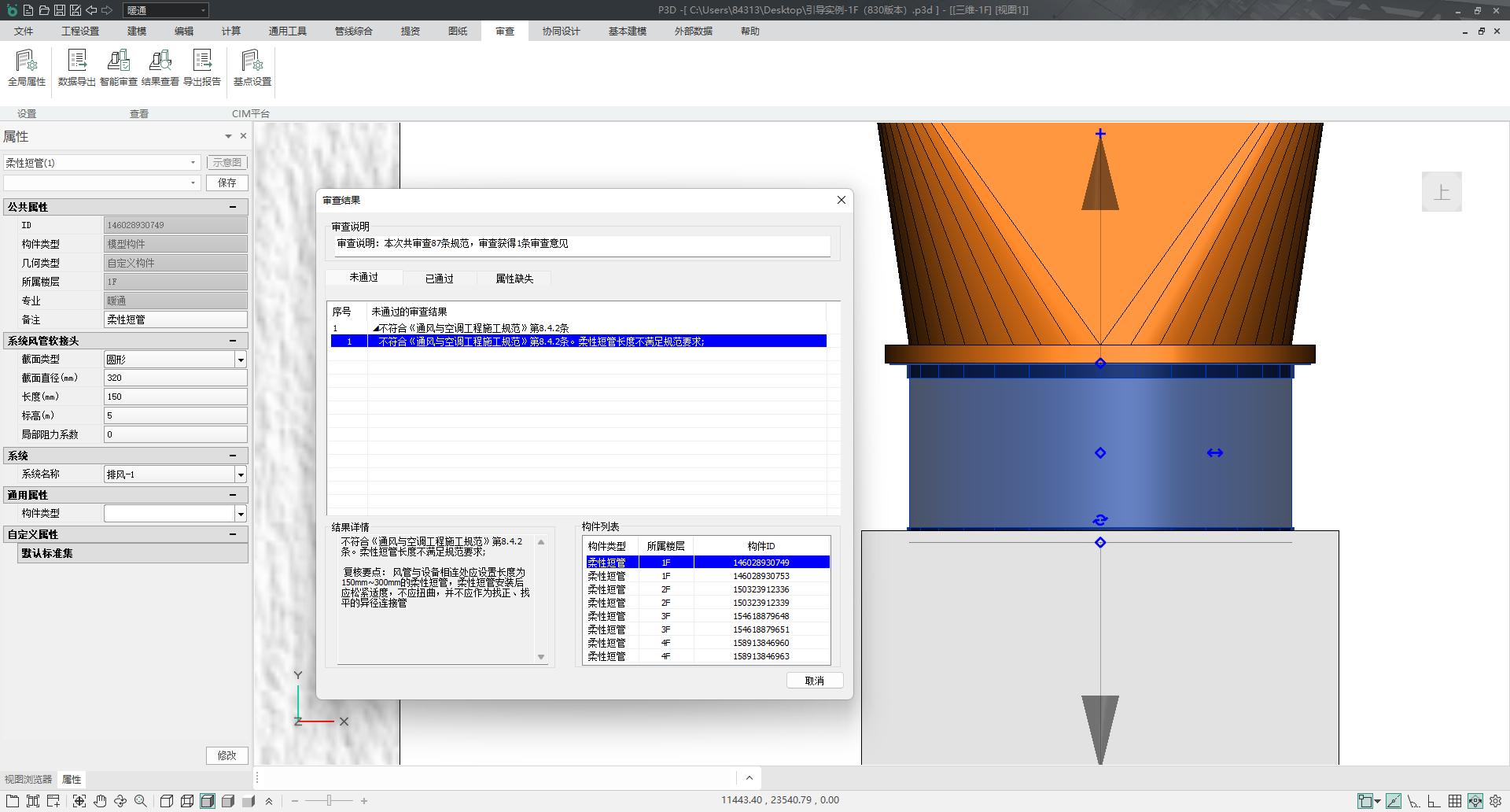 目录 搜索 展开 PKPM-BIM 项目应用案例教程第1章 建筑设计模块1.1 创建新项目1.1.1 创建新项目1.1.2 项目参数设置1.1.3 楼层设置1.1.4 放置轴网元素1.1.5 创建场地1.2 创建一层建筑主体1.2.1 创建柱1.2.2 创建墙1.2.3 创建楼板1.2.4 放置门窗1.2.4.1 普通门窗的设置1.2.4.2 常用设置集的配置1.2.4.3 自定义门窗设置1.2.4.4 放置门1.2.4.5 放置窗1.2.5 放置幕墙1.2.5.1 创建幕墙1.2.5.2 幕墙与墙体的剪切1.2.5.3 幕墙编辑1.2.6 创建房间、区域、楼梯1.2.6.1 创建房间1.2.6.2 创建防火分区1.2.6.3 创建楼梯1.3 创建二层建筑主体1.3.1 过滤选择1.3.2 局部复制1.3.3 二层构件修改1.3.3.1 墙体调整1.3.3.2 创建栏杆扶手1.3.3.3 放置门窗1.3.3.4 放置楼梯1.3.3.5 板上开洞1.3.3.6 创建房间和区域1.4创建三、四层建筑主体1.4.1 楼层复制1.4.2 楼板轮廓修改1.4.3 修改门窗1.5 创建屋顶层1.5.1 增强过滤器1.5.2 局部复制1.5.3 .同类构件的快速删除1.5.4 .墙体调整1.5.5 创建楼板1.5.6 创建门窗1.5.7 创建楼梯、栏杆1.5.8 创建房间和区域1.6 细部模型建立1.6.1 补充构件 1.6.1.1 增加台阶和坡道 1.6.1.2 增加栏杆扶手 1.6.1.3 增加雨棚 1.6.1.4 增加烟道 1.6.1.5 烟道洞口布置 1.6.2 放置素材1.6.2.1 素材库1.6.2.2 符号库1.6.2.3 参数化组件库1.7 清单1.8 智能审查1.9 出图1.9.1 出图流程介绍1.9.2 视图创建1.9.3 标注制图1.9.4 显示方案设置1.9.5 视图属性设置1.9.6 生成图纸1.9.7 成果导出第2章 结构设计模块2.1 新建项目 2.2 建立轴网 2.3 上部结构建模 2.4 楼层管理 2.5 计算分析前处理 2.6 计算结果查看 2.7 生成施工图 2.8 施工图审查第3章 暖通设计模块3.1 基本设置3.1.1 读取项目3.1.2 选择楼层3.1.3工程设置3.2 风系统建模3.2.1 风管绘制3.2.2 风口布置及连接3.3 空调水系统建模3.3.1 水管绘制3.3.2 风机盘管布置3.3.3 设备智能连接3.4 多联机系统3.4.1 室内外机布置3.4.2 多联机连管3.4.3 系统划分3.5 楼层复制3.6 材料统计3.6.1 材料统计3.6.2 材料结果查询3.7 模型审查3.7.1 全局属性3.7.2 条文审查3.7.3 调整模型3.8 暖通出图3.8.1 出图流程介绍3.8.2 视图映射创建3.8.3 标注制图3.8.4 显示方案设置3.8.5 视图属性设置3.8.6 生成图纸3.8.7 成果导出第4章 给排水设计模块4.1 设置4.1.1基本设置4.1.2系统设置4.2 给排水系统建模4.2.1 给排水管道绘制4.2.2 卫浴设备布置4.2.3 智能连接4.3 消火栓系统建模4.3.1 消火栓管绘制4.3.2 消火栓灭火器布置及连接4.4 喷淋系统建模4.4.1 喷头布置4.4.2 喷头连接4.4.3 识图建模4.5楼层复制4.6 材料统计4.6.1 材料统计4.6.2 材料结果查询4.7模型审查4.7.1 全局属性 4.7.2 条文审查4.7.3 调整模型4.8给排水出图4.8.1出图流程介绍4.8.2视图映射创建4.8.3标注制图4.8.4显示方案设置4.8.5视图属性设置4.8.6生成图纸4.8.7成果导出第5章 电气设计模块5.1 基本设置5.1.1 基本设置5.1.2 工程设置5.2 配电系统布置 5.2.1 配电柜布置5.2.2配电室桥架布置5.2.3配电室电缆沟布置5.2.4配电室变压器布置5.2.5配电箱布置5.3 照明系统布置5.3.1正常照明点位布置5.3.2应急照明照明点位布置5.4 火灾自动报警系统布置5.4.1 温感烟感点位布置5.4.2 消防广播点位布置5.4.3手报、声光报警器、消火栓启泵按钮、消防电话点位布置5.4.4消防端子箱布置5.5 弱电安防系统布置5.5.1监控摄像头点位布置5.5.2弱电插座点位布置5.5.3弱电机柜点位布置5.5.4识图建模5.6 平面布线5.6.1 设备连接5.6.2线管避让5.7楼层复制5.7.1 楼层复制5.8 材料统计5.8.1 材料统计5.8.2 材料结果查询5.9模型审查5.9.1 智能审查规则5.9.2 审查流程第6章 协同设计模块6.1 碰撞检查6.2 开洞提资6.2.1 生成开洞提资条件6.2.2 实际洞口处理生成6.3 净高分析6.3.1 净高设置6.3.2 净高平面6.3.3 净高检查6.4 模型链接6.5 合并工程 暂无相关搜索结果! 3.7.3 调整模型 3.选择规范条文后点击确定,软件自动根据内置规范内容对模型进行规范审查,生成审查结果,包括未通过、已通过和属性确实三大类;未通过条文显示具体条文内容,以及不满足条文构件列表;点击列表项可高亮定位模型构件,方便进行模型调整,如图3.7-4; 图 3.7-4 查看审查结果