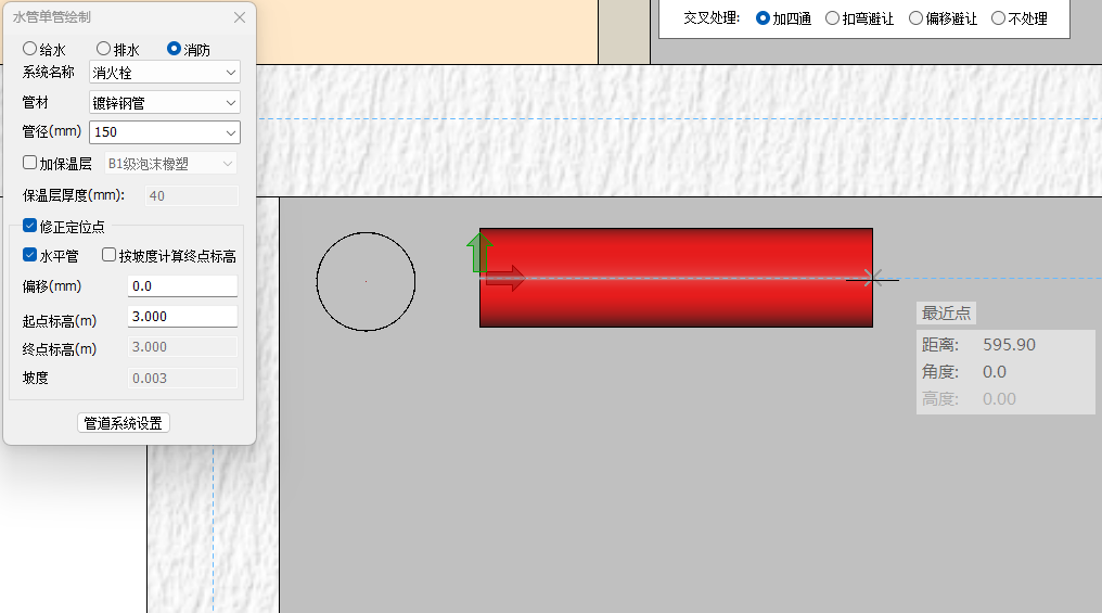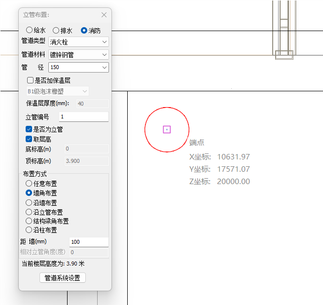 目录 搜索 展开 PKPM-BIM 项目应用案例教程第1章 建筑设计模块1.1 创建新项目1.1.1 创建新项目1.1.2 项目参数设置1.1.3 楼层设置1.1.4 放置轴网元素1.1.5 创建场地1.2 创建一层建筑主体1.2.1 创建柱1.2.2 创建墙1.2.3 创建楼板1.2.4 放置门窗1.2.4.1 普通门窗的设置1.2.4.2 常用设置集的配置1.2.4.3 自定义门窗设置1.2.4.4 放置门1.2.4.5 放置窗1.2.5 放置幕墙1.2.5.1 创建幕墙1.2.5.2 幕墙与墙体的剪切1.2.5.3 幕墙编辑1.2.6 创建房间、区域、楼梯1.2.6.1 创建房间1.2.6.2 创建防火分区1.2.6.3 创建楼梯1.3 创建二层建筑主体1.3.1 过滤选择1.3.2 局部复制1.3.3 二层构件修改1.3.3.1 墙体调整1.3.3.2 创建栏杆扶手1.3.3.3 放置门窗1.3.3.4 放置楼梯1.3.3.5 板上开洞1.3.3.6 创建房间和区域1.4创建三、四层建筑主体1.4.1 楼层复制1.4.2 楼板轮廓修改1.4.3 修改门窗1.5 创建屋顶层1.5.1 增强过滤器1.5.2 局部复制1.5.3 .同类构件的快速删除1.5.4 .墙体调整1.5.5 创建楼板1.5.6 创建门窗1.5.7 创建楼梯、栏杆1.5.8 创建房间和区域1.6 细部模型建立1.6.1 补充构件 1.6.1.1 增加台阶和坡道 1.6.1.2 增加栏杆扶手 1.6.1.3 增加雨棚 1.6.1.4 增加烟道 1.6.1.5 烟道洞口布置 1.6.2 放置素材1.6.2.1 素材库1.6.2.2 符号库1.6.2.3 参数化组件库1.7 清单1.8 智能审查1.9 出图1.9.1 出图流程介绍1.9.2 视图创建1.9.3 标注制图1.9.4 显示方案设置1.9.5 视图属性设置1.9.6 生成图纸1.9.7 成果导出第2章 结构设计模块2.1 新建项目 2.2 建立轴网 2.3 上部结构建模 2.4 楼层管理 2.5 计算分析前处理 2.6 计算结果查看 2.7 生成施工图 2.8 施工图审查第3章 暖通设计模块3.1 基本设置3.1.1 读取项目3.1.2 选择楼层3.1.3工程设置3.2 风系统建模3.2.1 风管绘制3.2.2 风口布置及连接3.3 空调水系统建模3.3.1 水管绘制3.3.2 风机盘管布置3.3.3 设备智能连接3.4 多联机系统3.4.1 室内外机布置3.4.2 多联机连管3.4.3 系统划分3.5 楼层复制3.6 材料统计3.6.1 材料统计3.6.2 材料结果查询3.7 模型审查3.7.1 全局属性3.7.2 条文审查3.7.3 调整模型3.8 暖通出图3.8.1 出图流程介绍3.8.2 视图映射创建3.8.3 标注制图3.8.4 显示方案设置3.8.5 视图属性设置3.8.6 生成图纸3.8.7 成果导出第4章 给排水设计模块4.1 设置4.1.1基本设置4.1.2系统设置4.2 给排水系统建模4.2.1 给排水管道绘制4.2.2 卫浴设备布置4.2.3 智能连接4.3 消火栓系统建模4.3.1 消火栓管绘制4.3.2 消火栓灭火器布置及连接4.4 喷淋系统建模4.4.1 喷头布置4.4.2 喷头连接4.4.3 识图建模4.5楼层复制4.6 材料统计4.6.1 材料统计4.6.2 材料结果查询4.7模型审查4.7.1 全局属性 4.7.2 条文审查4.7.3 调整模型4.8给排水出图4.8.1出图流程介绍4.8.2视图映射创建4.8.3标注制图4.8.4显示方案设置4.8.5视图属性设置4.8.6生成图纸4.8.7成果导出第5章 电气设计模块5.1 基本设置5.1.1 基本设置5.1.2 工程设置5.2 配电系统布置 5.2.1 配电柜布置5.2.2配电室桥架布置5.2.3配电室电缆沟布置5.2.4配电室变压器布置5.2.5配电箱布置5.3 照明系统布置5.3.1正常照明点位布置5.3.2应急照明照明点位布置5.4 火灾自动报警系统布置5.4.1 温感烟感点位布置5.4.2 消防广播点位布置5.4.3手报、声光报警器、消火栓启泵按钮、消防电话点位布置5.4.4消防端子箱布置5.5 弱电安防系统布置5.5.1监控摄像头点位布置5.5.2弱电插座点位布置5.5.3弱电机柜点位布置5.5.4识图建模5.6 平面布线5.6.1 设备连接5.6.2线管避让5.7楼层复制5.7.1 楼层复制5.8 材料统计5.8.1 材料统计5.8.2 材料结果查询5.9模型审查5.9.1 智能审查规则5.9.2 审查流程第6章 协同设计模块6.1 碰撞检查6.2 开洞提资6.2.1 生成开洞提资条件6.2.2 实际洞口处理生成6.3 净高分析6.3.1 净高设置6.3.2 净高平面6.3.3 净高检查6.4 模型链接6.5 合并工程 暂无相关搜索结果! 4.3.1 消火栓管绘制 操作步骤:1.与给排水管道绘制相同,点击水管绘制功能,选择消火栓管管道类型,调整管径为DN150,勾选修正定位点及水平管,调整起点标高为3.8m;点击立管绘制功能,勾选立管标高为“取层高”,完成消火栓管干管和立管的绘制。如图4.3-1; 图4.3-1 消火栓管绘制
