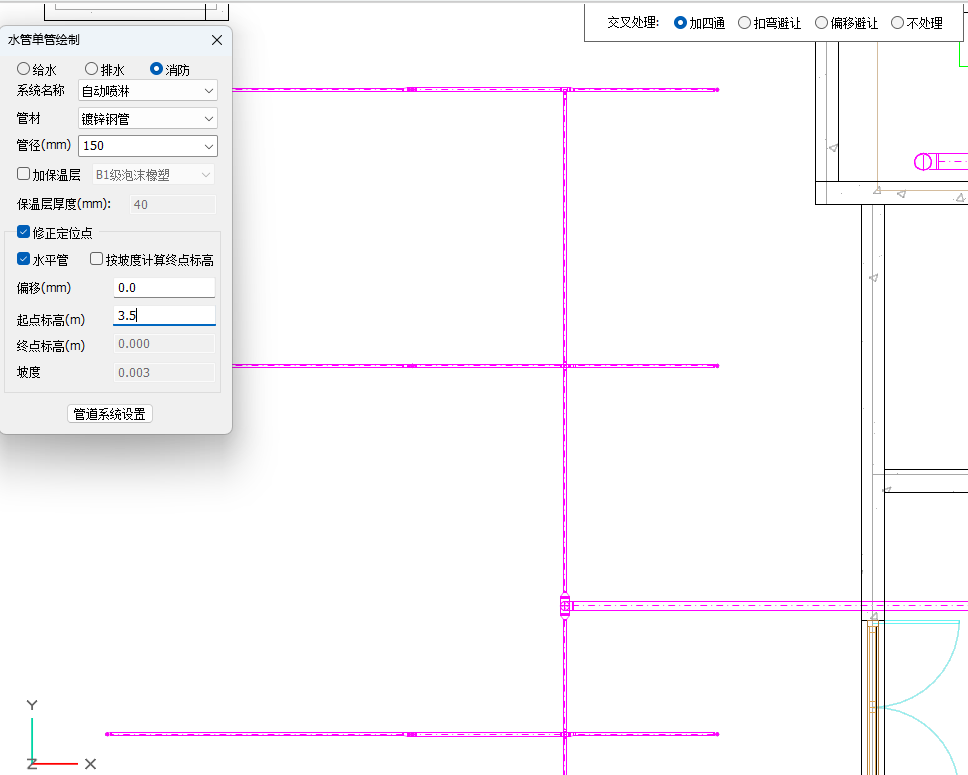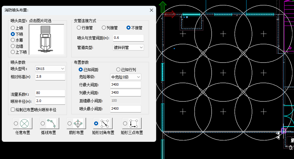 目录 搜索 展开 PKPM-BIM 项目应用案例教程第1章 建筑设计模块1.1 创建新项目1.1.1 创建新项目1.1.2 项目参数设置1.1.3 楼层设置1.1.4 放置轴网元素1.1.5 创建场地1.2 创建一层建筑主体1.2.1 创建柱1.2.2 创建墙1.2.3 创建楼板1.2.4 放置门窗1.2.4.1 普通门窗的设置1.2.4.2 常用设置集的配置1.2.4.3 自定义门窗设置1.2.4.4 放置门1.2.4.5 放置窗1.2.5 放置幕墙1.2.5.1 创建幕墙1.2.5.2 幕墙与墙体的剪切1.2.5.3 幕墙编辑1.2.6 创建房间、区域、楼梯1.2.6.1 创建房间1.2.6.2 创建防火分区1.2.6.3 创建楼梯1.3 创建二层建筑主体1.3.1 过滤选择1.3.2 局部复制1.3.3 二层构件修改1.3.3.1 墙体调整1.3.3.2 创建栏杆扶手1.3.3.3 放置门窗1.3.3.4 放置楼梯1.3.3.5 板上开洞1.3.3.6 创建房间和区域1.4创建三、四层建筑主体1.4.1 楼层复制1.4.2 楼板轮廓修改1.4.3 修改门窗1.5 创建屋顶层1.5.1 增强过滤器1.5.2 局部复制1.5.3 .同类构件的快速删除1.5.4 .墙体调整1.5.5 创建楼板1.5.6 创建门窗1.5.7 创建楼梯、栏杆1.5.8 创建房间和区域1.6 细部模型建立1.6.1 补充构件 1.6.1.1 增加台阶和坡道 1.6.1.2 增加栏杆扶手 1.6.1.3 增加雨棚 1.6.1.4 增加烟道 1.6.1.5 烟道洞口布置 1.6.2 放置素材1.6.2.1 素材库1.6.2.2 符号库1.6.2.3 参数化组件库1.7 清单1.8 智能审查1.9 出图1.9.1 出图流程介绍1.9.2 视图创建1.9.3 标注制图1.9.4 显示方案设置1.9.5 视图属性设置1.9.6 生成图纸1.9.7 成果导出第2章 结构设计模块2.1 新建项目 2.2 建立轴网 2.3 上部结构建模 2.4 楼层管理 2.5 计算分析前处理 2.6 计算结果查看 2.7 生成施工图 2.8 施工图审查第3章 暖通设计模块3.1 基本设置3.1.1 读取项目3.1.2 选择楼层3.1.3工程设置3.2 风系统建模3.2.1 风管绘制3.2.2 风口布置及连接3.3 空调水系统建模3.3.1 水管绘制3.3.2 风机盘管布置3.3.3 设备智能连接3.4 多联机系统3.4.1 室内外机布置3.4.2 多联机连管3.4.3 系统划分3.5 楼层复制3.6 材料统计3.6.1 材料统计3.6.2 材料结果查询3.7 模型审查3.7.1 全局属性3.7.2 条文审查3.7.3 调整模型3.8 暖通出图3.8.1 出图流程介绍3.8.2 视图映射创建3.8.3 标注制图3.8.4 显示方案设置3.8.5 视图属性设置3.8.6 生成图纸3.8.7 成果导出第4章 给排水设计模块4.1 设置4.1.1基本设置4.1.2系统设置4.2 给排水系统建模4.2.1 给排水管道绘制4.2.2 卫浴设备布置4.2.3 智能连接4.3 消火栓系统建模4.3.1 消火栓管绘制4.3.2 消火栓灭火器布置及连接4.4 喷淋系统建模4.4.1 喷头布置4.4.2 喷头连接4.4.3 识图建模4.5楼层复制4.6 材料统计4.6.1 材料统计4.6.2 材料结果查询4.7模型审查4.7.1 全局属性 4.7.2 条文审查4.7.3 调整模型4.8给排水出图4.8.1出图流程介绍4.8.2视图映射创建4.8.3标注制图4.8.4显示方案设置4.8.5视图属性设置4.8.6生成图纸4.8.7成果导出第5章 电气设计模块5.1 基本设置5.1.1 基本设置5.1.2 工程设置5.2 配电系统布置 5.2.1 配电柜布置5.2.2配电室桥架布置5.2.3配电室电缆沟布置5.2.4配电室变压器布置5.2.5配电箱布置5.3 照明系统布置5.3.1正常照明点位布置5.3.2应急照明照明点位布置5.4 火灾自动报警系统布置5.4.1 温感烟感点位布置5.4.2 消防广播点位布置5.4.3手报、声光报警器、消火栓启泵按钮、消防电话点位布置5.4.4消防端子箱布置5.5 弱电安防系统布置5.5.1监控摄像头点位布置5.5.2弱电插座点位布置5.5.3弱电机柜点位布置5.5.4识图建模5.6 平面布线5.6.1 设备连接5.6.2线管避让5.7楼层复制5.7.1 楼层复制5.8 材料统计5.8.1 材料统计5.8.2 材料结果查询5.9模型审查5.9.1 智能审查规则5.9.2 审查流程第6章 协同设计模块6.1 碰撞检查6.2 开洞提资6.2.1 生成开洞提资条件6.2.2 实际洞口处理生成6.3 净高分析6.3.1 净高设置6.3.2 净高平面6.3.3 净高检查6.4 模型链接6.5 合并工程 暂无相关搜索结果! 4.4.1 喷头布置 操作步骤:1.在自动喷洒命令栏中选择喷头布置,修改喷头类型为下喷,调整布置方式为矩形对角布置,喷头标高调整为2.8m,接管方式调整为不接管,选择布置区域,将危险等级调整为中危险Ⅱ级,软件将根据危险等级智能调整消防喷头间距,并完成指定区域内的喷头布置。如图4.4-1; 图4.4-1 消防喷头布置 2.点击水管绘制,点击消防,选择自动喷洒管系统名称,并勾选修正定位点和水平管,将起点标高调整为3.2m,绘制消防喷淋管道。如图4.4-2; 图4.4-2 绘制喷淋管道
