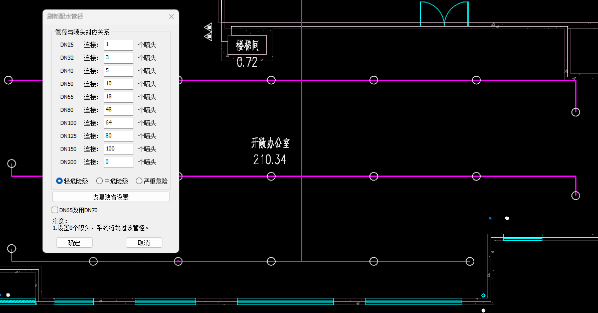 目录 搜索 展开 PKPM-BIM 项目应用案例教程第1章 建筑设计模块1.1 创建新项目1.1.1 创建新项目1.1.2 项目参数设置1.1.3 楼层设置1.1.4 放置轴网元素1.1.5 创建场地1.2 创建一层建筑主体1.2.1 创建柱1.2.2 创建墙1.2.3 创建楼板1.2.4 放置门窗1.2.4.1 普通门窗的设置1.2.4.2 常用设置集的配置1.2.4.3 自定义门窗设置1.2.4.4 放置门1.2.4.5 放置窗1.2.5 放置幕墙1.2.5.1 创建幕墙1.2.5.2 幕墙与墙体的剪切1.2.5.3 幕墙编辑1.2.6 创建房间、区域、楼梯1.2.6.1 创建房间1.2.6.2 创建防火分区1.2.6.3 创建楼梯1.3 创建二层建筑主体1.3.1 过滤选择1.3.2 局部复制1.3.3 二层构件修改1.3.3.1 墙体调整1.3.3.2 创建栏杆扶手1.3.3.3 放置门窗1.3.3.4 放置楼梯1.3.3.5 板上开洞1.3.3.6 创建房间和区域1.4创建三、四层建筑主体1.4.1 楼层复制1.4.2 楼板轮廓修改1.4.3 修改门窗1.5 创建屋顶层1.5.1 增强过滤器1.5.2 局部复制1.5.3 .同类构件的快速删除1.5.4 .墙体调整1.5.5 创建楼板1.5.6 创建门窗1.5.7 创建楼梯、栏杆1.5.8 创建房间和区域1.6 细部模型建立1.6.1 补充构件 1.6.1.1 增加台阶和坡道 1.6.1.2 增加栏杆扶手 1.6.1.3 增加雨棚 1.6.1.4 增加烟道 1.6.1.5 烟道洞口布置 1.6.2 放置素材1.6.2.1 素材库1.6.2.2 符号库1.6.2.3 参数化组件库1.7 清单1.8 智能审查1.9 出图1.9.1 出图流程介绍1.9.2 视图创建1.9.3 标注制图1.9.4 显示方案设置1.9.5 视图属性设置1.9.6 生成图纸1.9.7 成果导出第2章 结构设计模块2.1 新建项目 2.2 建立轴网 2.3 上部结构建模 2.4 楼层管理 2.5 计算分析前处理 2.6 计算结果查看 2.7 生成施工图 2.8 施工图审查第3章 暖通设计模块3.1 基本设置3.1.1 读取项目3.1.2 选择楼层3.1.3工程设置3.2 风系统建模3.2.1 风管绘制3.2.2 风口布置及连接3.3 空调水系统建模3.3.1 水管绘制3.3.2 风机盘管布置3.3.3 设备智能连接3.4 多联机系统3.4.1 室内外机布置3.4.2 多联机连管3.4.3 系统划分3.5 楼层复制3.6 材料统计3.6.1 材料统计3.6.2 材料结果查询3.7 模型审查3.7.1 全局属性3.7.2 条文审查3.7.3 调整模型3.8 暖通出图3.8.1 出图流程介绍3.8.2 视图映射创建3.8.3 标注制图3.8.4 显示方案设置3.8.5 视图属性设置3.8.6 生成图纸3.8.7 成果导出第4章 给排水设计模块4.1 设置4.1.1基本设置4.1.2系统设置4.2 给排水系统建模4.2.1 给排水管道绘制4.2.2 卫浴设备布置4.2.3 智能连接4.3 消火栓系统建模4.3.1 消火栓管绘制4.3.2 消火栓灭火器布置及连接4.4 喷淋系统建模4.4.1 喷头布置4.4.2 喷头连接4.4.3 识图建模4.5楼层复制4.6 材料统计4.6.1 材料统计4.6.2 材料结果查询4.7模型审查4.7.1 全局属性 4.7.2 条文审查4.7.3 调整模型4.8给排水出图4.8.1出图流程介绍4.8.2视图映射创建4.8.3标注制图4.8.4显示方案设置4.8.5视图属性设置4.8.6生成图纸4.8.7成果导出第5章 电气设计模块5.1 基本设置5.1.1 基本设置5.1.2 工程设置5.2 配电系统布置 5.2.1 配电柜布置5.2.2配电室桥架布置5.2.3配电室电缆沟布置5.2.4配电室变压器布置5.2.5配电箱布置5.3 照明系统布置5.3.1正常照明点位布置5.3.2应急照明照明点位布置5.4 火灾自动报警系统布置5.4.1 温感烟感点位布置5.4.2 消防广播点位布置5.4.3手报、声光报警器、消火栓启泵按钮、消防电话点位布置5.4.4消防端子箱布置5.5 弱电安防系统布置5.5.1监控摄像头点位布置5.5.2弱电插座点位布置5.5.3弱电机柜点位布置5.5.4识图建模5.6 平面布线5.6.1 设备连接5.6.2线管避让5.7楼层复制5.7.1 楼层复制5.8 材料统计5.8.1 材料统计5.8.2 材料结果查询5.9模型审查5.9.1 智能审查规则5.9.2 审查流程第6章 协同设计模块6.1 碰撞检查6.2 开洞提资6.2.1 生成开洞提资条件6.2.2 实际洞口处理生成6.3 净高分析6.3.1 净高设置6.3.2 净高平面6.3.3 净高检查6.4 模型链接6.5 合并工程 暂无相关搜索结果! 4.4.2 喷头连接 1) 智能连接点击消防喷头连接,勾选连接管标高取管道的标高,圈选所要连接的喷洒干管及对应的喷头,完成自动喷洒的连接(如果干管与支路未能自动生成四通,可通过水管连接中的四通实现快速连接).如图4.4-3; 图4.4-3 消防喷头连接 2) 刷新管径使用刷新喷淋管径功能,设置危险等级和分支连接喷头个数,然后选择喷淋系统分支起始段,一键刷新喷淋管径。如图4.4-4; 图4.4-4 刷新喷淋管径