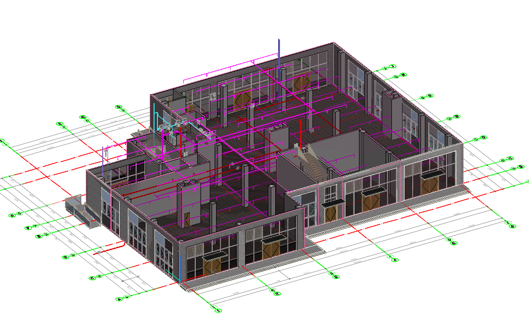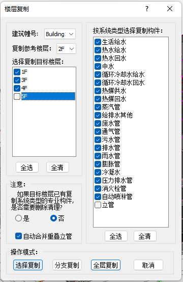 目录 搜索 展开 PKPM-BIM 项目应用案例教程第1章 建筑设计模块1.1 创建新项目1.1.1 创建新项目1.1.2 项目参数设置1.1.3 楼层设置1.1.4 放置轴网元素1.1.5 创建场地1.2 创建一层建筑主体1.2.1 创建柱1.2.2 创建墙1.2.3 创建楼板1.2.4 放置门窗1.2.4.1 普通门窗的设置1.2.4.2 常用设置集的配置1.2.4.3 自定义门窗设置1.2.4.4 放置门1.2.4.5 放置窗1.2.5 放置幕墙1.2.5.1 创建幕墙1.2.5.2 幕墙与墙体的剪切1.2.5.3 幕墙编辑1.2.6 创建房间、区域、楼梯1.2.6.1 创建房间1.2.6.2 创建防火分区1.2.6.3 创建楼梯1.3 创建二层建筑主体1.3.1 过滤选择1.3.2 局部复制1.3.3 二层构件修改1.3.3.1 墙体调整1.3.3.2 创建栏杆扶手1.3.3.3 放置门窗1.3.3.4 放置楼梯1.3.3.5 板上开洞1.3.3.6 创建房间和区域1.4创建三、四层建筑主体1.4.1 楼层复制1.4.2 楼板轮廓修改1.4.3 修改门窗1.5 创建屋顶层1.5.1 增强过滤器1.5.2 局部复制1.5.3 .同类构件的快速删除1.5.4 .墙体调整1.5.5 创建楼板1.5.6 创建门窗1.5.7 创建楼梯、栏杆1.5.8 创建房间和区域1.6 细部模型建立1.6.1 补充构件 1.6.1.1 增加台阶和坡道 1.6.1.2 增加栏杆扶手 1.6.1.3 增加雨棚 1.6.1.4 增加烟道 1.6.1.5 烟道洞口布置 1.6.2 放置素材1.6.2.1 素材库1.6.2.2 符号库1.6.2.3 参数化组件库1.7 清单1.8 智能审查1.9 出图1.9.1 出图流程介绍1.9.2 视图创建1.9.3 标注制图1.9.4 显示方案设置1.9.5 视图属性设置1.9.6 生成图纸1.9.7 成果导出第2章 结构设计模块2.1 新建项目 2.2 建立轴网 2.3 上部结构建模 2.4 楼层管理 2.5 计算分析前处理 2.6 计算结果查看 2.7 生成施工图 2.8 施工图审查第3章 暖通设计模块3.1 基本设置3.1.1 读取项目3.1.2 选择楼层3.1.3工程设置3.2 风系统建模3.2.1 风管绘制3.2.2 风口布置及连接3.3 空调水系统建模3.3.1 水管绘制3.3.2 风机盘管布置3.3.3 设备智能连接3.4 多联机系统3.4.1 室内外机布置3.4.2 多联机连管3.4.3 系统划分3.5 楼层复制3.6 材料统计3.6.1 材料统计3.6.2 材料结果查询3.7 模型审查3.7.1 全局属性3.7.2 条文审查3.7.3 调整模型3.8 暖通出图3.8.1 出图流程介绍3.8.2 视图映射创建3.8.3 标注制图3.8.4 显示方案设置3.8.5 视图属性设置3.8.6 生成图纸3.8.7 成果导出第4章 给排水设计模块4.1 设置4.1.1基本设置4.1.2系统设置4.2 给排水系统建模4.2.1 给排水管道绘制4.2.2 卫浴设备布置4.2.3 智能连接4.3 消火栓系统建模4.3.1 消火栓管绘制4.3.2 消火栓灭火器布置及连接4.4 喷淋系统建模4.4.1 喷头布置4.4.2 喷头连接4.4.3 识图建模4.5楼层复制4.6 材料统计4.6.1 材料统计4.6.2 材料结果查询4.7模型审查4.7.1 全局属性 4.7.2 条文审查4.7.3 调整模型4.8给排水出图4.8.1出图流程介绍4.8.2视图映射创建4.8.3标注制图4.8.4显示方案设置4.8.5视图属性设置4.8.6生成图纸4.8.7成果导出第5章 电气设计模块5.1 基本设置5.1.1 基本设置5.1.2 工程设置5.2 配电系统布置 5.2.1 配电柜布置5.2.2配电室桥架布置5.2.3配电室电缆沟布置5.2.4配电室变压器布置5.2.5配电箱布置5.3 照明系统布置5.3.1正常照明点位布置5.3.2应急照明照明点位布置5.4 火灾自动报警系统布置5.4.1 温感烟感点位布置5.4.2 消防广播点位布置5.4.3手报、声光报警器、消火栓启泵按钮、消防电话点位布置5.4.4消防端子箱布置5.5 弱电安防系统布置5.5.1监控摄像头点位布置5.5.2弱电插座点位布置5.5.3弱电机柜点位布置5.5.4识图建模5.6 平面布线5.6.1 设备连接5.6.2线管避让5.7楼层复制5.7.1 楼层复制5.8 材料统计5.8.1 材料统计5.8.2 材料结果查询5.9模型审查5.9.1 智能审查规则5.9.2 审查流程第6章 协同设计模块6.1 碰撞检查6.2 开洞提资6.2.1 生成开洞提资条件6.2.2 实际洞口处理生成6.3 净高分析6.3.1 净高设置6.3.2 净高平面6.3.3 净高检查6.4 模型链接6.5 合并工程 暂无相关搜索结果! 4.5楼层复制 操作步骤: 点击给排水建模,选择楼层复制功能,以楼层2为复制参考楼层,取消楼层5层的勾选状态,点击选择复制,框选需要楼层复制的区域,鼠标右键,开始进行楼层复制。如图4.5-1; 图4.5-1 给排水楼层复制 2.完成楼层复制后,点击全楼模型,能够对给排水模型进行查看。通过鼠标右键中的视图参照,可完成其他专业模型信息的实时参照。如图4.5-2 ; 图4.5-2 全楼给排水模型
