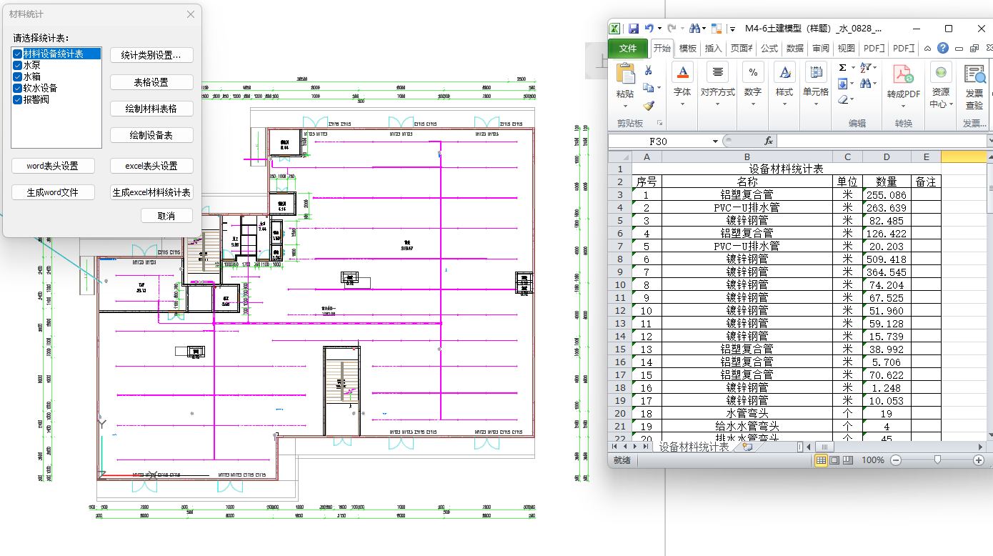 目录 搜索 展开 PKPM-BIM 项目应用案例教程第1章 建筑设计模块1.1 创建新项目1.1.1 创建新项目1.1.2 项目参数设置1.1.3 楼层设置1.1.4 放置轴网元素1.1.5 创建场地1.2 创建一层建筑主体1.2.1 创建柱1.2.2 创建墙1.2.3 创建楼板1.2.4 放置门窗1.2.4.1 普通门窗的设置1.2.4.2 常用设置集的配置1.2.4.3 自定义门窗设置1.2.4.4 放置门1.2.4.5 放置窗1.2.5 放置幕墙1.2.5.1 创建幕墙1.2.5.2 幕墙与墙体的剪切1.2.5.3 幕墙编辑1.2.6 创建房间、区域、楼梯1.2.6.1 创建房间1.2.6.2 创建防火分区1.2.6.3 创建楼梯1.3 创建二层建筑主体1.3.1 过滤选择1.3.2 局部复制1.3.3 二层构件修改1.3.3.1 墙体调整1.3.3.2 创建栏杆扶手1.3.3.3 放置门窗1.3.3.4 放置楼梯1.3.3.5 板上开洞1.3.3.6 创建房间和区域1.4创建三、四层建筑主体1.4.1 楼层复制1.4.2 楼板轮廓修改1.4.3 修改门窗1.5 创建屋顶层1.5.1 增强过滤器1.5.2 局部复制1.5.3 .同类构件的快速删除1.5.4 .墙体调整1.5.5 创建楼板1.5.6 创建门窗1.5.7 创建楼梯、栏杆1.5.8 创建房间和区域1.6 细部模型建立1.6.1 补充构件 1.6.1.1 增加台阶和坡道 1.6.1.2 增加栏杆扶手 1.6.1.3 增加雨棚 1.6.1.4 增加烟道 1.6.1.5 烟道洞口布置 1.6.2 放置素材1.6.2.1 素材库1.6.2.2 符号库1.6.2.3 参数化组件库1.7 清单1.8 智能审查1.9 出图1.9.1 出图流程介绍1.9.2 视图创建1.9.3 标注制图1.9.4 显示方案设置1.9.5 视图属性设置1.9.6 生成图纸1.9.7 成果导出第2章 结构设计模块2.1 新建项目 2.2 建立轴网 2.3 上部结构建模 2.4 楼层管理 2.5 计算分析前处理 2.6 计算结果查看 2.7 生成施工图 2.8 施工图审查第3章 暖通设计模块3.1 基本设置3.1.1 读取项目3.1.2 选择楼层3.1.3工程设置3.2 风系统建模3.2.1 风管绘制3.2.2 风口布置及连接3.3 空调水系统建模3.3.1 水管绘制3.3.2 风机盘管布置3.3.3 设备智能连接3.4 多联机系统3.4.1 室内外机布置3.4.2 多联机连管3.4.3 系统划分3.5 楼层复制3.6 材料统计3.6.1 材料统计3.6.2 材料结果查询3.7 模型审查3.7.1 全局属性3.7.2 条文审查3.7.3 调整模型3.8 暖通出图3.8.1 出图流程介绍3.8.2 视图映射创建3.8.3 标注制图3.8.4 显示方案设置3.8.5 视图属性设置3.8.6 生成图纸3.8.7 成果导出第4章 给排水设计模块4.1 设置4.1.1基本设置4.1.2系统设置4.2 给排水系统建模4.2.1 给排水管道绘制4.2.2 卫浴设备布置4.2.3 智能连接4.3 消火栓系统建模4.3.1 消火栓管绘制4.3.2 消火栓灭火器布置及连接4.4 喷淋系统建模4.4.1 喷头布置4.4.2 喷头连接4.4.3 识图建模4.5楼层复制4.6 材料统计4.6.1 材料统计4.6.2 材料结果查询4.7模型审查4.7.1 全局属性 4.7.2 条文审查4.7.3 调整模型4.8给排水出图4.8.1出图流程介绍4.8.2视图映射创建4.8.3标注制图4.8.4显示方案设置4.8.5视图属性设置4.8.6生成图纸4.8.7成果导出第5章 电气设计模块5.1 基本设置5.1.1 基本设置5.1.2 工程设置5.2 配电系统布置 5.2.1 配电柜布置5.2.2配电室桥架布置5.2.3配电室电缆沟布置5.2.4配电室变压器布置5.2.5配电箱布置5.3 照明系统布置5.3.1正常照明点位布置5.3.2应急照明照明点位布置5.4 火灾自动报警系统布置5.4.1 温感烟感点位布置5.4.2 消防广播点位布置5.4.3手报、声光报警器、消火栓启泵按钮、消防电话点位布置5.4.4消防端子箱布置5.5 弱电安防系统布置5.5.1监控摄像头点位布置5.5.2弱电插座点位布置5.5.3弱电机柜点位布置5.5.4识图建模5.6 平面布线5.6.1 设备连接5.6.2线管避让5.7楼层复制5.7.1 楼层复制5.8 材料统计5.8.1 材料统计5.8.2 材料结果查询5.9模型审查5.9.1 智能审查规则5.9.2 审查流程第6章 协同设计模块6.1 碰撞检查6.2 开洞提资6.2.1 生成开洞提资条件6.2.2 实际洞口处理生成6.3 净高分析6.3.1 净高设置6.3.2 净高平面6.3.3 净高检查6.4 模型链接6.5 合并工程 暂无相关搜索结果! 4.6.1 材料统计 操作步骤:1.点击【视图】-【统计】模块中的统计材料功能,勾选统计表所包含信息,并可通过表格的表头设置及统计类别设置调整对应统计模式和统计表格样式,点击生成文件,生成材料统计表格。如图4.6-1; 图4.6-1 给排水材料统计设置