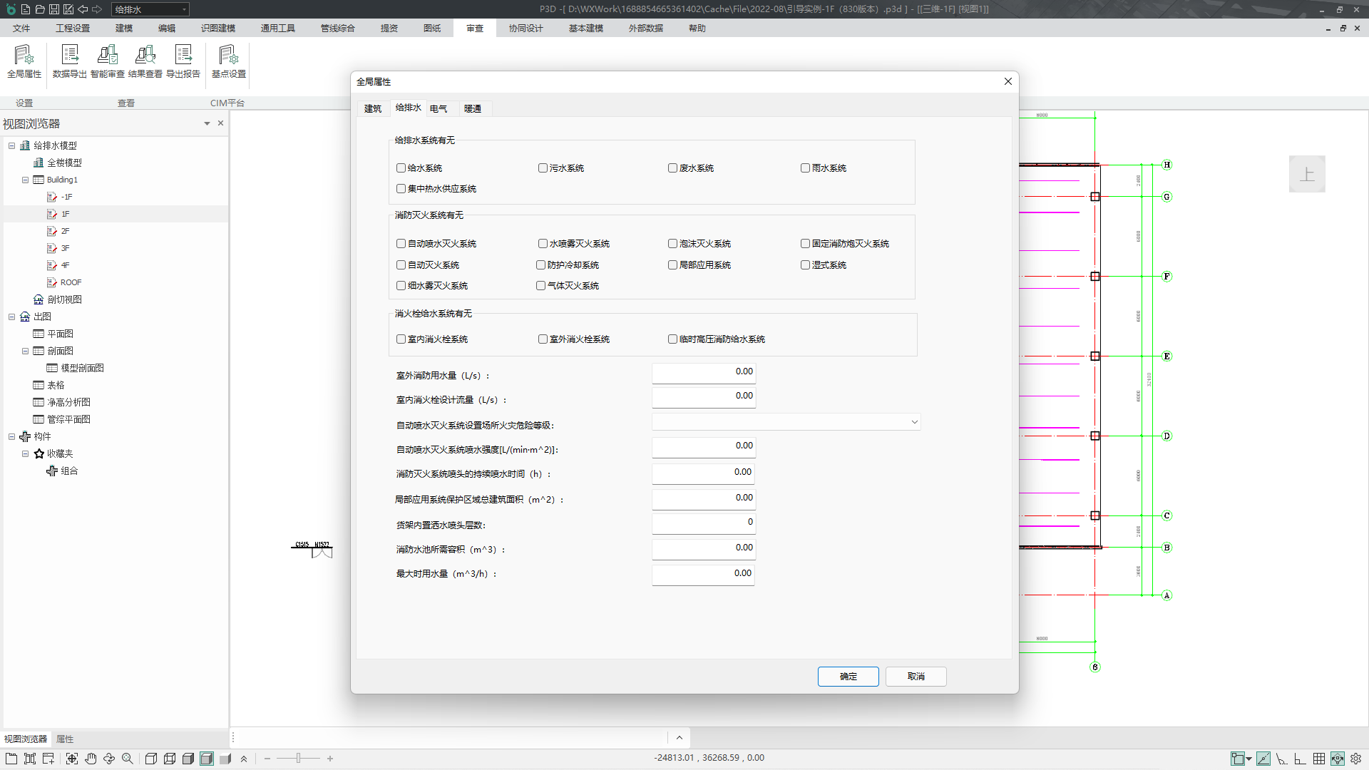 目录 搜索 展开 PKPM-BIM 项目应用案例教程第1章 建筑设计模块1.1 创建新项目1.1.1 创建新项目1.1.2 项目参数设置1.1.3 楼层设置1.1.4 放置轴网元素1.1.5 创建场地1.2 创建一层建筑主体1.2.1 创建柱1.2.2 创建墙1.2.3 创建楼板1.2.4 放置门窗1.2.4.1 普通门窗的设置1.2.4.2 常用设置集的配置1.2.4.3 自定义门窗设置1.2.4.4 放置门1.2.4.5 放置窗1.2.5 放置幕墙1.2.5.1 创建幕墙1.2.5.2 幕墙与墙体的剪切1.2.5.3 幕墙编辑1.2.6 创建房间、区域、楼梯1.2.6.1 创建房间1.2.6.2 创建防火分区1.2.6.3 创建楼梯1.3 创建二层建筑主体1.3.1 过滤选择1.3.2 局部复制1.3.3 二层构件修改1.3.3.1 墙体调整1.3.3.2 创建栏杆扶手1.3.3.3 放置门窗1.3.3.4 放置楼梯1.3.3.5 板上开洞1.3.3.6 创建房间和区域1.4创建三、四层建筑主体1.4.1 楼层复制1.4.2 楼板轮廓修改1.4.3 修改门窗1.5 创建屋顶层1.5.1 增强过滤器1.5.2 局部复制1.5.3 .同类构件的快速删除1.5.4 .墙体调整1.5.5 创建楼板1.5.6 创建门窗1.5.7 创建楼梯、栏杆1.5.8 创建房间和区域1.6 细部模型建立1.6.1 补充构件 1.6.1.1 增加台阶和坡道 1.6.1.2 增加栏杆扶手 1.6.1.3 增加雨棚 1.6.1.4 增加烟道 1.6.1.5 烟道洞口布置 1.6.2 放置素材1.6.2.1 素材库1.6.2.2 符号库1.6.2.3 参数化组件库1.7 清单1.8 智能审查1.9 出图1.9.1 出图流程介绍1.9.2 视图创建1.9.3 标注制图1.9.4 显示方案设置1.9.5 视图属性设置1.9.6 生成图纸1.9.7 成果导出第2章 结构设计模块2.1 新建项目 2.2 建立轴网 2.3 上部结构建模 2.4 楼层管理 2.5 计算分析前处理 2.6 计算结果查看 2.7 生成施工图 2.8 施工图审查第3章 暖通设计模块3.1 基本设置3.1.1 读取项目3.1.2 选择楼层3.1.3工程设置3.2 风系统建模3.2.1 风管绘制3.2.2 风口布置及连接3.3 空调水系统建模3.3.1 水管绘制3.3.2 风机盘管布置3.3.3 设备智能连接3.4 多联机系统3.4.1 室内外机布置3.4.2 多联机连管3.4.3 系统划分3.5 楼层复制3.6 材料统计3.6.1 材料统计3.6.2 材料结果查询3.7 模型审查3.7.1 全局属性3.7.2 条文审查3.7.3 调整模型3.8 暖通出图3.8.1 出图流程介绍3.8.2 视图映射创建3.8.3 标注制图3.8.4 显示方案设置3.8.5 视图属性设置3.8.6 生成图纸3.8.7 成果导出第4章 给排水设计模块4.1 设置4.1.1基本设置4.1.2系统设置4.2 给排水系统建模4.2.1 给排水管道绘制4.2.2 卫浴设备布置4.2.3 智能连接4.3 消火栓系统建模4.3.1 消火栓管绘制4.3.2 消火栓灭火器布置及连接4.4 喷淋系统建模4.4.1 喷头布置4.4.2 喷头连接4.4.3 识图建模4.5楼层复制4.6 材料统计4.6.1 材料统计4.6.2 材料结果查询4.7模型审查4.7.1 全局属性 4.7.2 条文审查4.7.3 调整模型4.8给排水出图4.8.1出图流程介绍4.8.2视图映射创建4.8.3标注制图4.8.4显示方案设置4.8.5视图属性设置4.8.6生成图纸4.8.7成果导出第5章 电气设计模块5.1 基本设置5.1.1 基本设置5.1.2 工程设置5.2 配电系统布置 5.2.1 配电柜布置5.2.2配电室桥架布置5.2.3配电室电缆沟布置5.2.4配电室变压器布置5.2.5配电箱布置5.3 照明系统布置5.3.1正常照明点位布置5.3.2应急照明照明点位布置5.4 火灾自动报警系统布置5.4.1 温感烟感点位布置5.4.2 消防广播点位布置5.4.3手报、声光报警器、消火栓启泵按钮、消防电话点位布置5.4.4消防端子箱布置5.5 弱电安防系统布置5.5.1监控摄像头点位布置5.5.2弱电插座点位布置5.5.3弱电机柜点位布置5.5.4识图建模5.6 平面布线5.6.1 设备连接5.6.2线管避让5.7楼层复制5.7.1 楼层复制5.8 材料统计5.8.1 材料统计5.8.2 材料结果查询5.9模型审查5.9.1 智能审查规则5.9.2 审查流程第6章 协同设计模块6.1 碰撞检查6.2 开洞提资6.2.1 生成开洞提资条件6.2.2 实际洞口处理生成6.3 净高分析6.3.1 净高设置6.3.2 净高平面6.3.3 净高检查6.4 模型链接6.5 合并工程 暂无相关搜索结果! 4.7.1 全局属性 点击【审查】,首先弹出全局属性设置界面,根据项目情况选择给水系统、消防系统,并填写消防用水量等相关参数,另外也可直接点击【全局属性】命令进行设置;如图4.7-2; 图4.7-2 全局属性设置