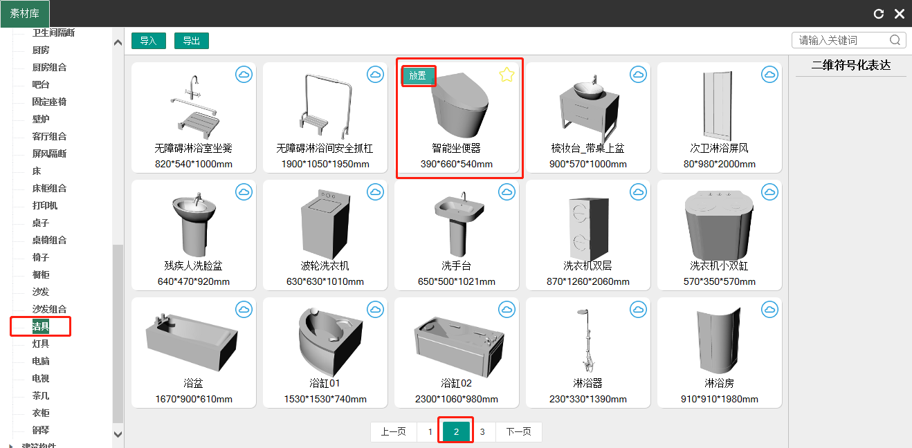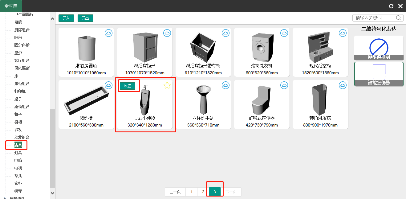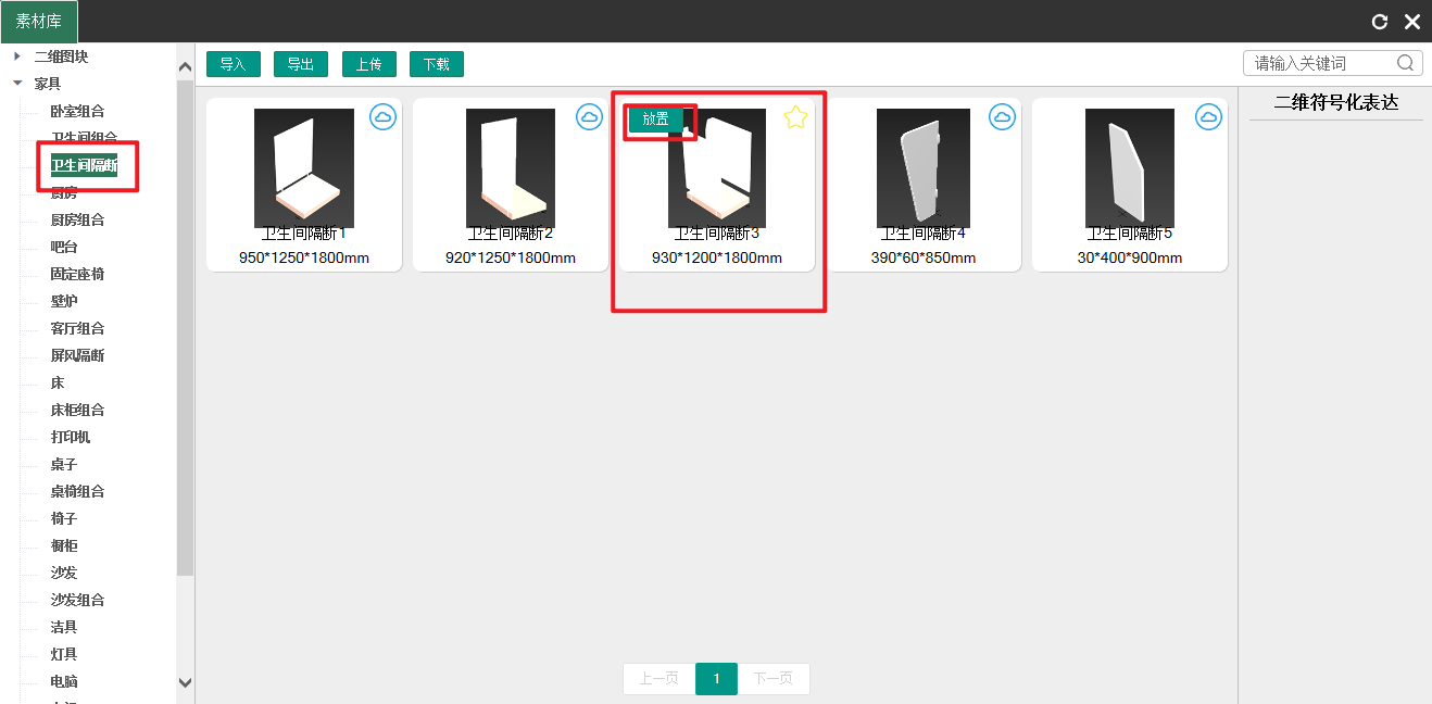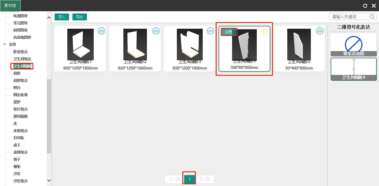 - 在“素材”菜单栏中,找到并点击“素材库”,在弹出的素材库面板中找到卫生间隔断,选择“卫生间隔断4”,并点击“放置”按钮,如下图所示: