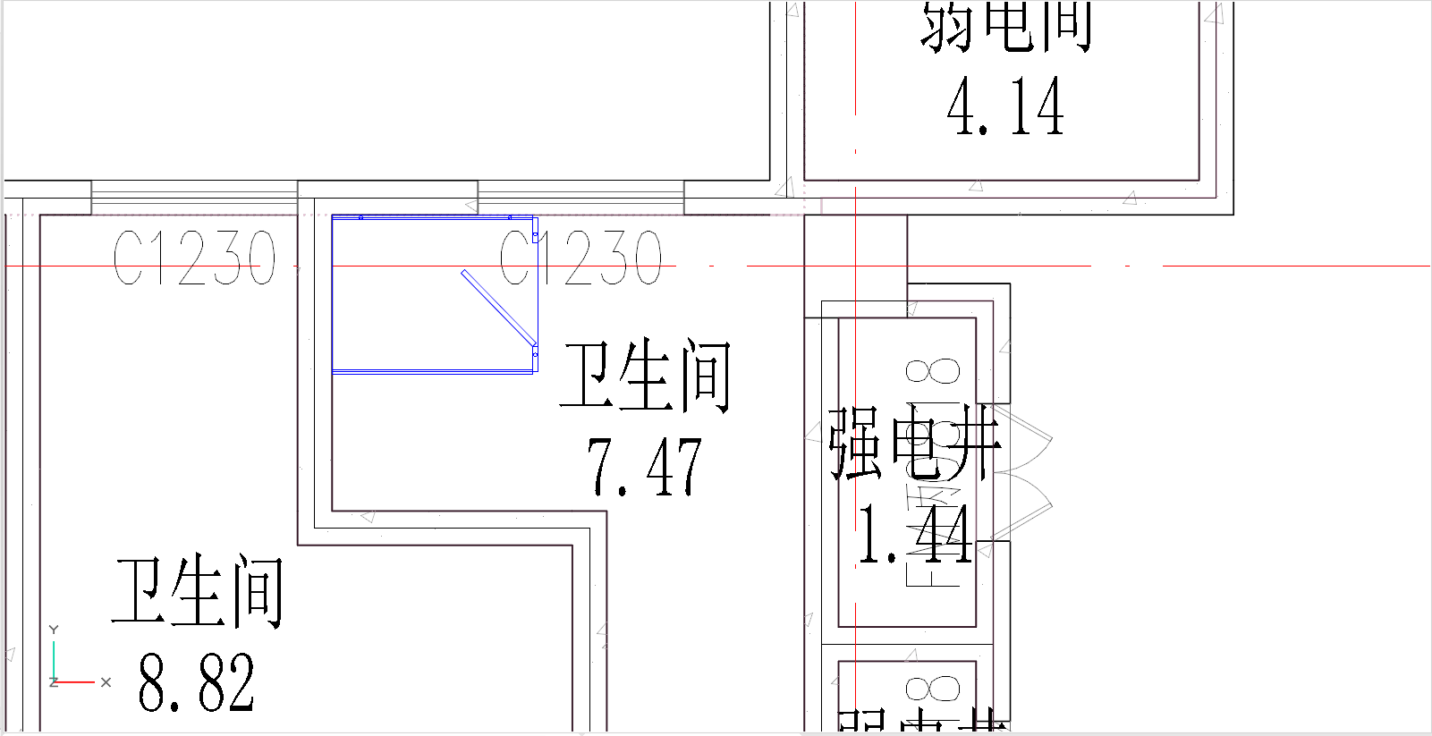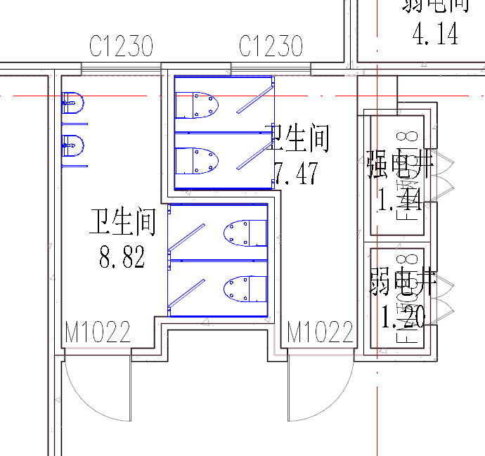 - 通过“编辑”菜单栏下的“移动”、“复制”、“镜像”等工具,对一层卫生间的素材进行位置调整,完成后如下图所示: