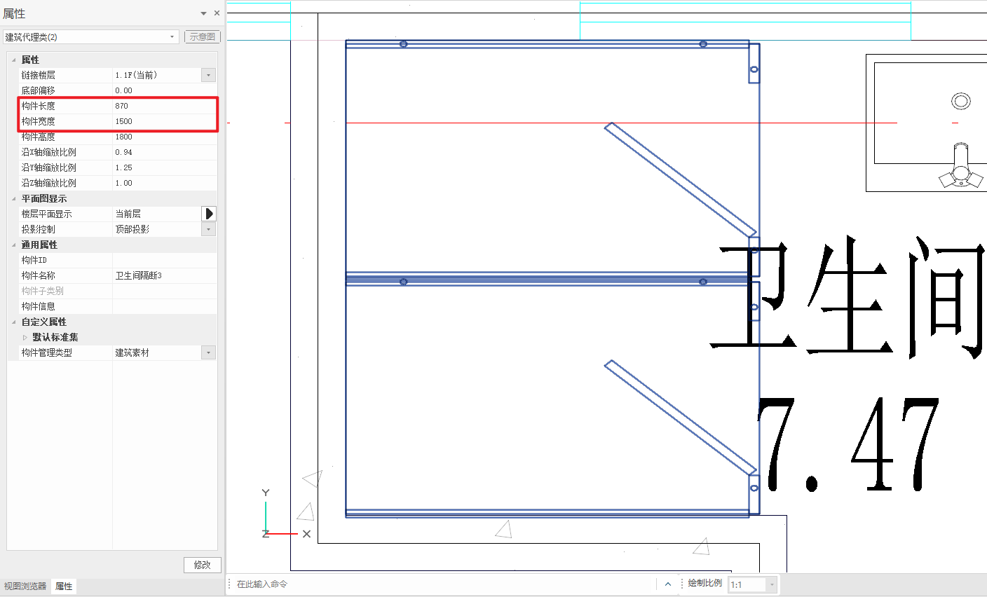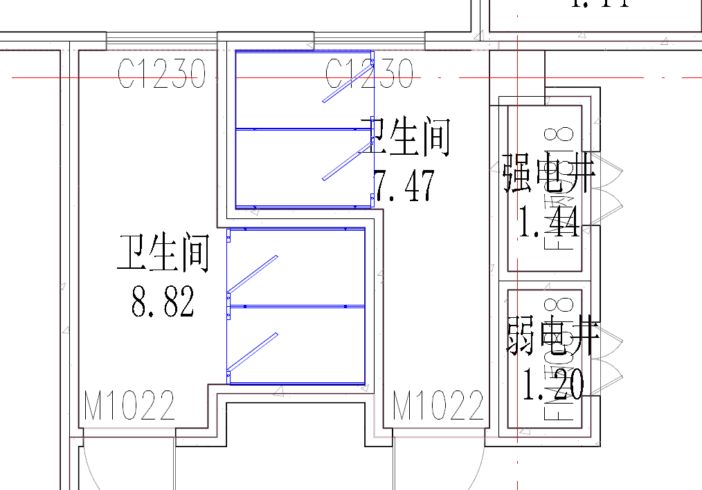 - 点击“放置”后,在一层平面卫生间中布置隔断,布置完成后如下图所示: