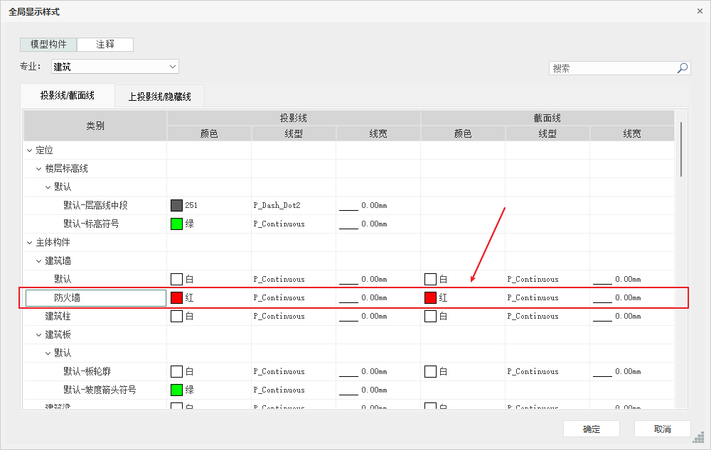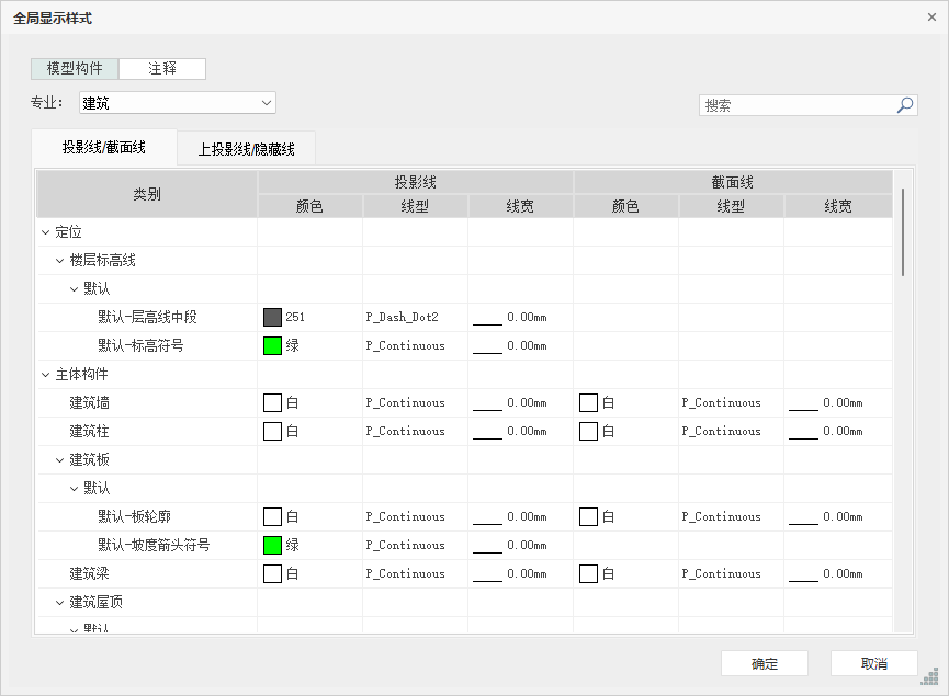 ”全局显示样式可以对项目全局控制,可为不同类别和子类别的模型构件、二维注释指定线样式,可以对构件不同剖切状态下的线样式进行设置,分别对线颜色、线型、线宽进行设置,如图所示:
