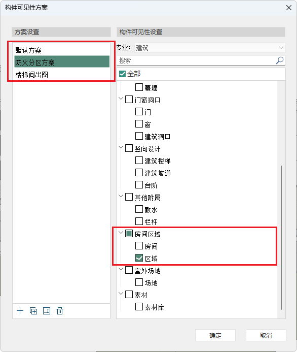 ”构件可见性方案中,可进行可见性方案的创建及修改,可对构件类别或子类别进行可见性设置,新建防火分区方案,方便在在出防火分区图时使用,如图所示: