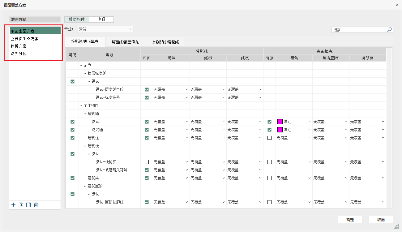 ”视图覆盖方案中,设定不同的显示方案,方便在不同视图中重复调用,如图所示: