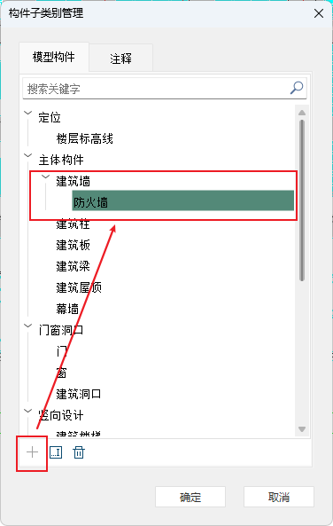 ”构件子类别管理,可以对对有特殊显示需求的构件类别进行子类别创建,例如墙类别下新建防火墙子类别,后续出图时可以控制普通墙和防火墙设置不同的显示样式,如图所示: