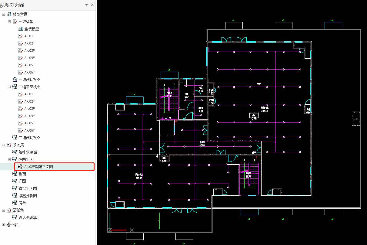- 左侧项目浏览器,双击【视图集】下【消防平面】的对应平面图: