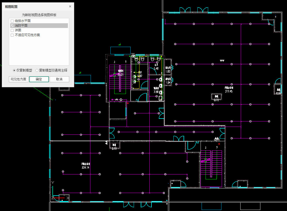 - 为映射视图选择视图样板,勾选消防平面,点击确定: