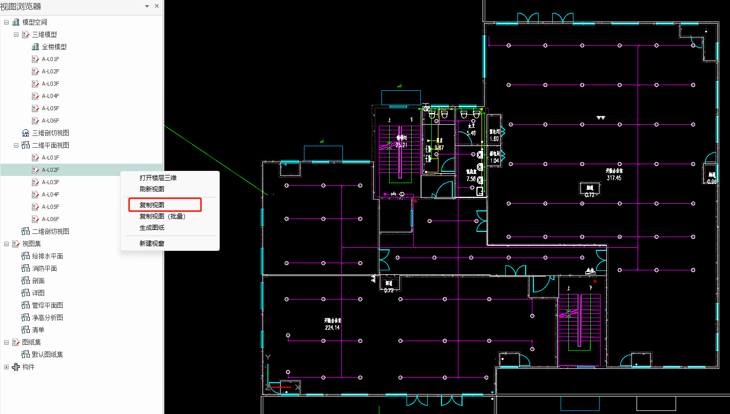 - 选择项目浏览器中的二维平面视图的某一层视图,点击鼠标右键,选择“复制视图”