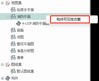 - 若想修改视图映射显示的对应系统时(例如消防平面图中,仅显示喷淋系统且不显示消火栓系统的内容时),可右键点击【视图集】下【消防平面】,点击【构件可见性方案】,在弹出的界面中取消勾选“消火栓系统”。