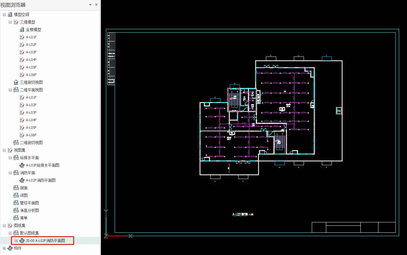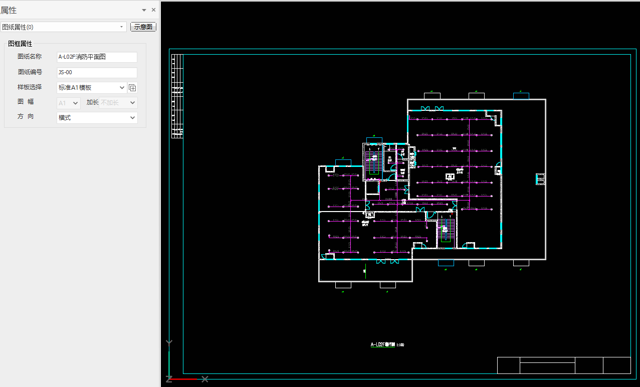 2.在图纸空间查看一层消防平面图,对视图名称与图名不一致的地方进行图名设置,选中图名,在属性栏位置输入图纸名称,可以点击设置将比例去掉勾选,最终完成一层平面图出图,如图所示: