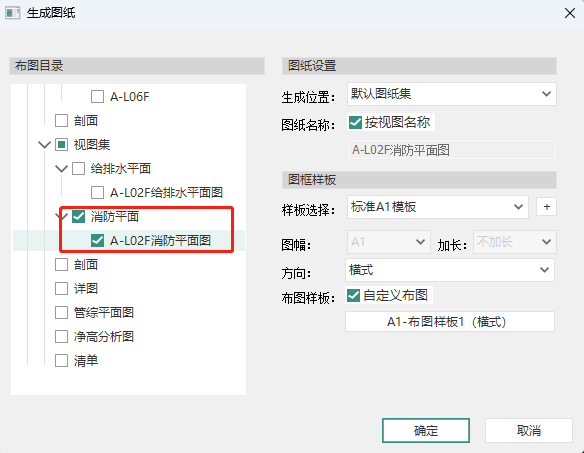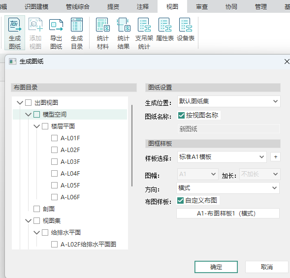 - 点击项目浏览器下的视图映射,点击右键,选择“生成图纸”,或者点击视图下的“生成图纸”功能。勾选视图集的1F平面图视图,设置图纸名称为一层平面图,勾选自定义布图且选择布图样式2,点击生成图纸,然后在图纸空间中布置视图,将一层平面图输出在图纸空间,如图所示;