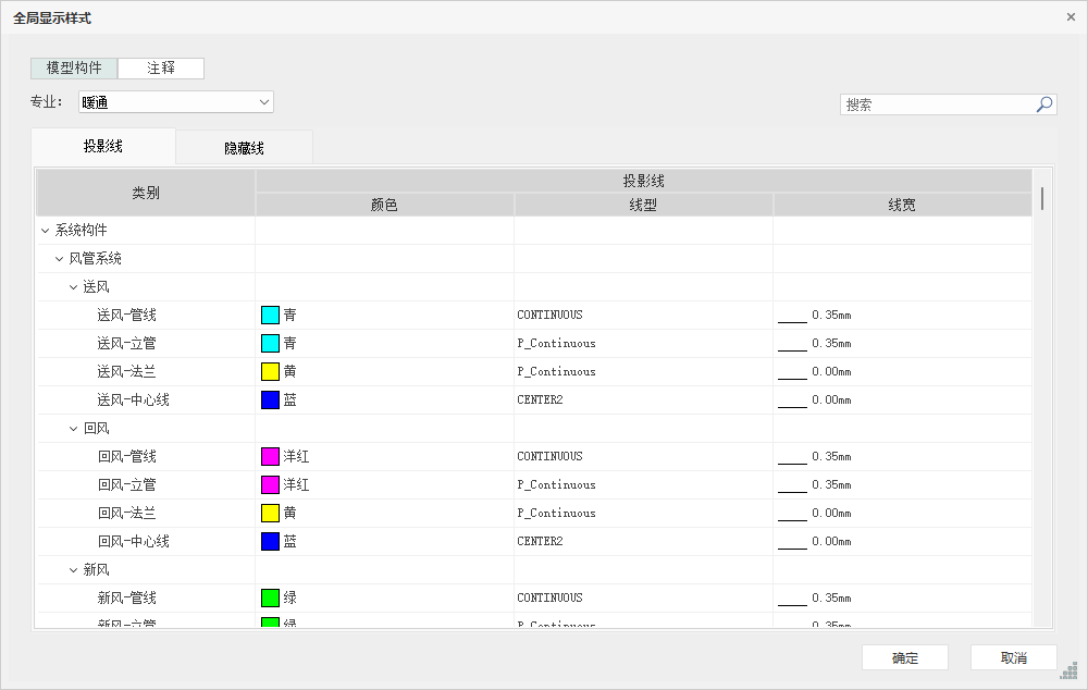 - 在管理菜单中的“全局显示样式”可以对项目全局控制,可为不同类别和子类别的模型构件、二维注释指定线样式,可以对构件不同剖切状态下的线样式进行设置,分别对线颜色、线型、线宽进行设置,如图所示: