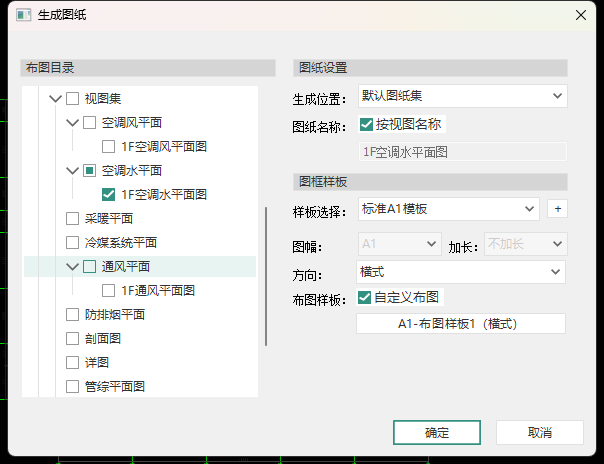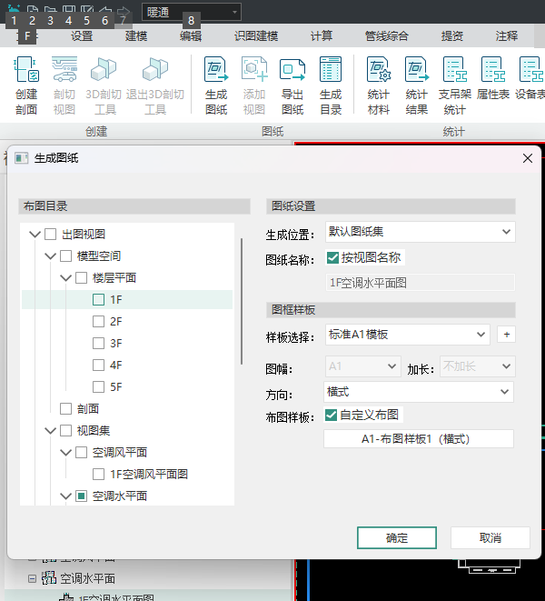 - 点击项目浏览器下的视图映射,点击右键,选择“生成图纸”,或者点击视图下的“生成图纸”功能。勾选视图集的1F平面图视图,设置图纸名称为一层平面图,勾选自定义布图且选择布图样式2,点击生成图纸,然后在图纸空间中布置视图,将一层平面图输出在图纸空间,如图所示;
