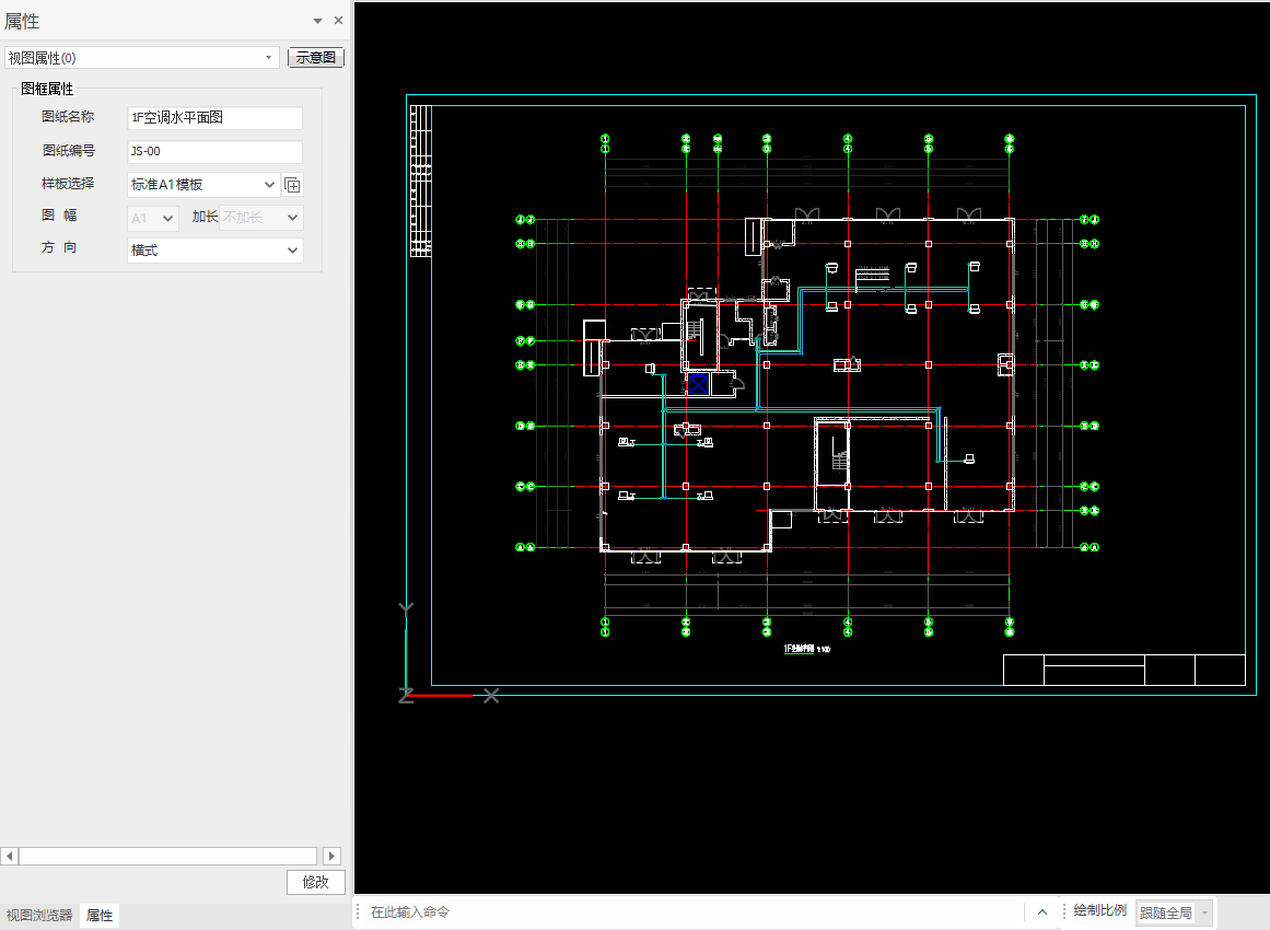2.在图纸空间查看一层空调水平面图,对视图名称与图名不一致的地方进行图名设置,选中图名,在属性栏位置输入图纸名称,可以点击设置将比例去掉勾选,最终完成一层平面图出图,如图所示: