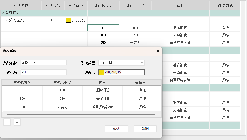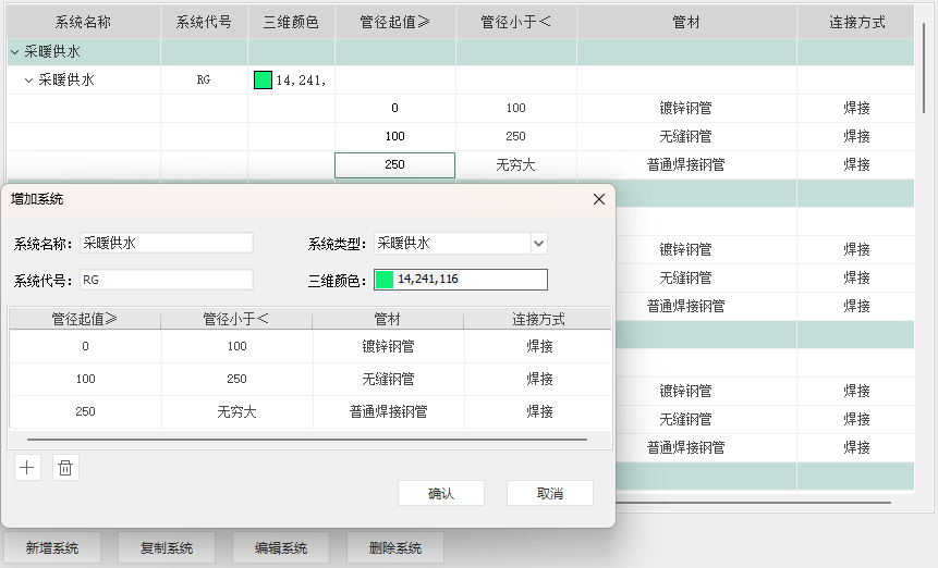 系统代号、三维颜色、管径起值、管材、连接方式,均可直接在表格中直接修改编辑。