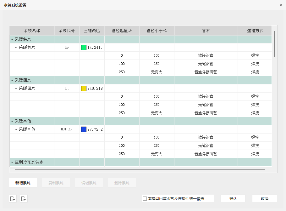 如果需要修改所有已建模型的管材及连接方式的属性,则需要勾选上该选项,点击确认后,会自动按照水管系统设置表中的规则,刷新已建模型中的水管和连接件。