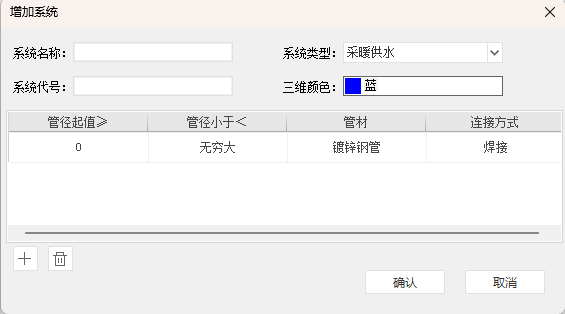 在对应的系统类型下任意新增水管系统,并设置相应参数。左下方的加号按钮可增加管径分区的数量,删除按钮则为删除相应的管径分区。