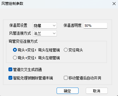 “风管连接方式”、“弯管变径连接方式”、“管道交叉处理”和“删除管道管道末端自动处理”为风系统共用设置。