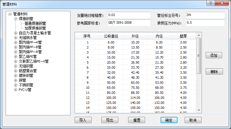 【添加】 添加新的管径行,可复制选中行,再修改参数,需点击确定进行保存。