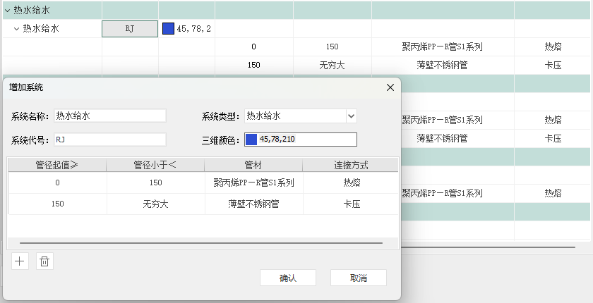 【新增系统】在对应的系统类型下任意新增水管系统,并设置相应参数。左下方的加号按钮可增加管径分区的数量,删除按钮则为删除相应的管径分区。