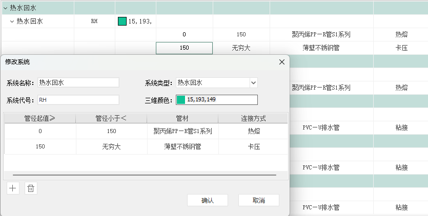 系统代号、三维颜色、管径起值、管材、连接方式,均可直接在表格中直接修改编辑。