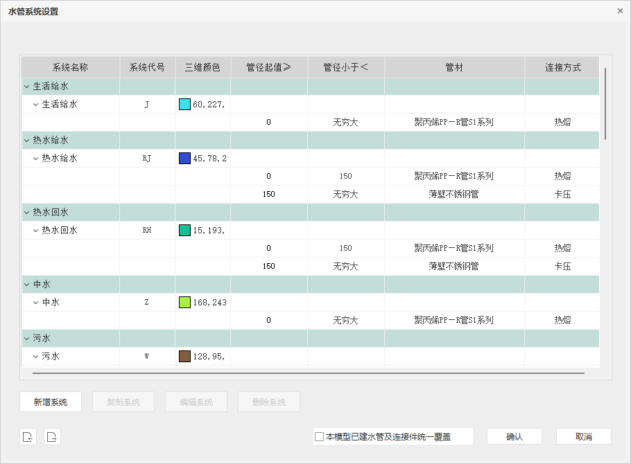 【本模型已建水管及连接件统一覆盖】如果需要修改所有已建模型的管材及连接方式的属性,则需要勾选上该选项,点击确认后,会自动按照水管系统设置表中的规则,刷新已建模型中的水管和连接件。