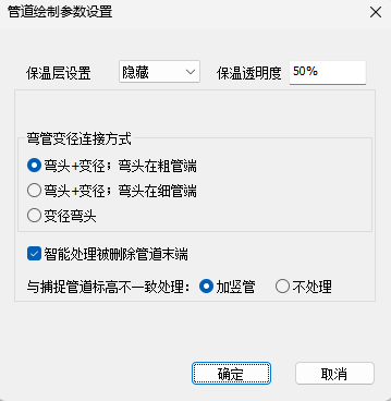 “水管连接方式”、“弯管变径连接方式”、“双管绘制时水管间距”和“删除管道管道末端自动处理”为水系统共用设置。