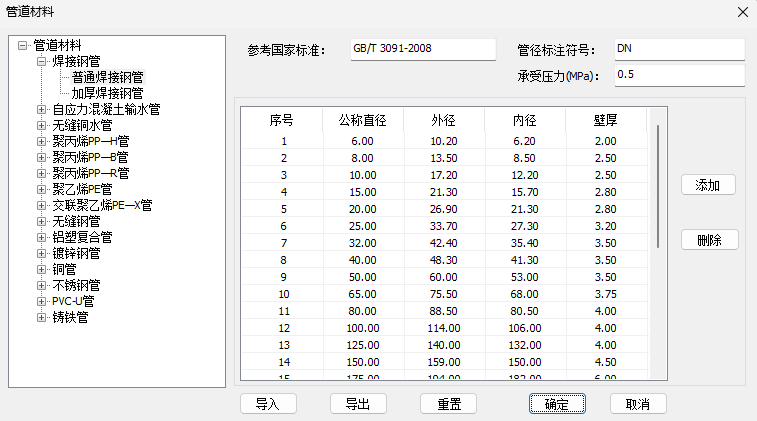 【添加】添加新的管径行,可复制选中行,再修改参数,需点击确定进行保存。