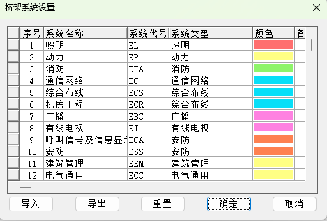 点击【设置】-【系统设置】-【桥架系统设置】,界面如下图所示:如图所示,在桥架系统设置界面中完成桥架系统定义、系统名称、系统代号修改、系统类型设置和绘图颜色设置。