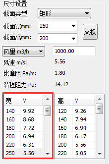 【截面宽】 如截面类型为矩形,则截面宽为管道宽度;如截面类型为圆形,则截面宽为圆管直径。点击下拉菜单可切换风管截面宽,在当前截面高及风量状态下,实时计算对应的风速、比摩阻和沿程阻力,沿程阻力在绘制风管时根据风管的长度动态显示。