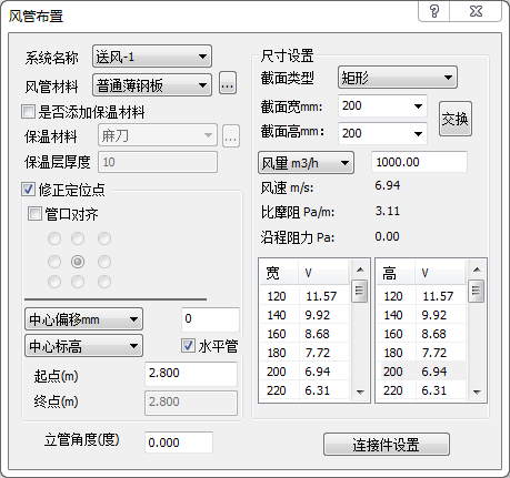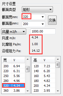 【截面宽对应风速列表】 次列表将在当前截面宽和风量状态下的,不同截面宽及对应的风速显示出,方便查询与选择。且选择列表中的宽尺寸可联动到当前截面宽尺寸。例如图表 5.1.1-2中,截面宽对应风速列表显示的为在当前高(200)和风量(1000)的状态下,个宽度尺寸对应的风速。在列表中选择截面宽(320),则联动到当前截面宽尺寸,且实时计算对应的风速、比摩阻和沿程阻力,沿程阻力在绘制风管时根据风管的长度动态显示。【截面高对应风速列表】与此功能相同。