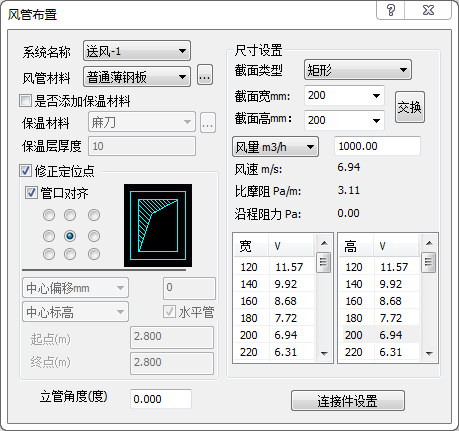 - 配置风管参数:选择风管材质(如镀锌钢板)、风管形状(矩形/圆形)、尺寸规格(支持手动输入或标准库选择)及保温层参数。