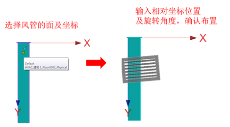 【捕捉面布置】风口捕捉面布置如图所示。选择要布置的风管的面,及预览的相对坐标系,确认后输入坐标及自身选择角度,确认完成布置。