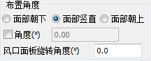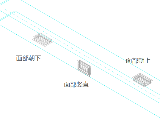 【**系统名称**】 在此处切换系统名称。 【**风口标高**】 在此处设置风口的相对标高。 【**布置角度**】 有面部朝下、面部竖直、面部朝上三种布置方式。布置效果如图所示。可修改[**角度**]对话框中的数值确定其旋转角度。当点击[面部竖直]布置方式时,会多出[**风口面板旋转角度**]参数设置,此角度可确定面部竖直时其沿面板方向转动的角度。