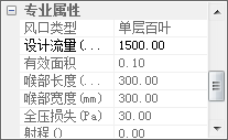 【绘制参数】 选择系统风口和自定义风口绘制参数列表不同。如图5.1.2-2所示。系统风口可修改显示的所有属性参数。自定义风口仅可修改设计流量(风量)参数。