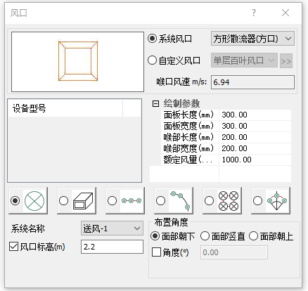 风口类型分为系统风口和自定义风口。系统风口为参数化风口,自定义风口为从设备口中导入的风口。在下拉菜单中选择目标风口。