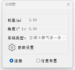 ;点击【建模】-【多联机】-【分歧管】,分歧管布置界面如图所示,在图示界面中可以选择连接功能或者任意布置功能。