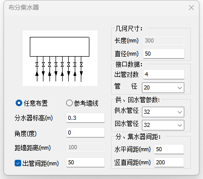 [距墙距离]参考墙线布置时,分集水器距墙距离。