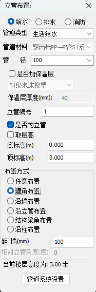 点击【建模】-【布水立管】。布水立管界面如图所示,在界面中可对系统名称、水管材料、管径等进行设置和修改。同时可以设置管道标高、偏移距离和立管角度等绘制参数。