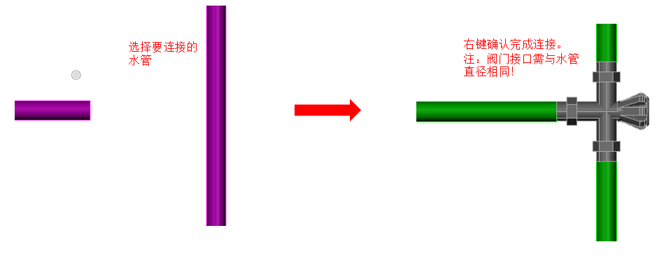 【按管口】根据管道截面尺寸对阀门进行缩放,使阀门接口尺寸与管道界面一致后在进行管道和阀门连接。