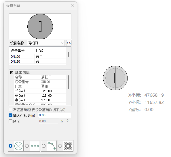 清扫口布置界面如图所示,在图示界面中选择清扫口型号,确定清扫口布置点,将清扫口旋转到需要的角度即可完成布置。